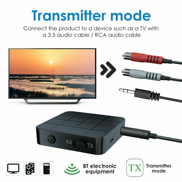 2. Режим передатчика: Беспроводная передача звука с телевизора без Bluetooth, домашней стереосистемы или CD-плеера на Bluetooth-гарнитуру или динамик