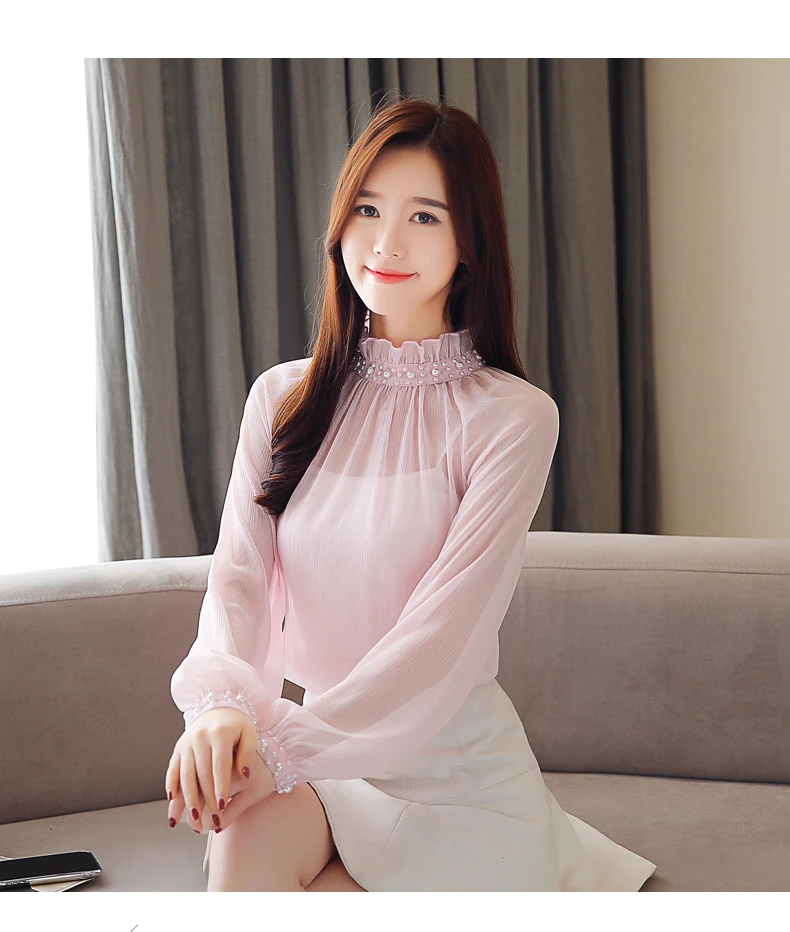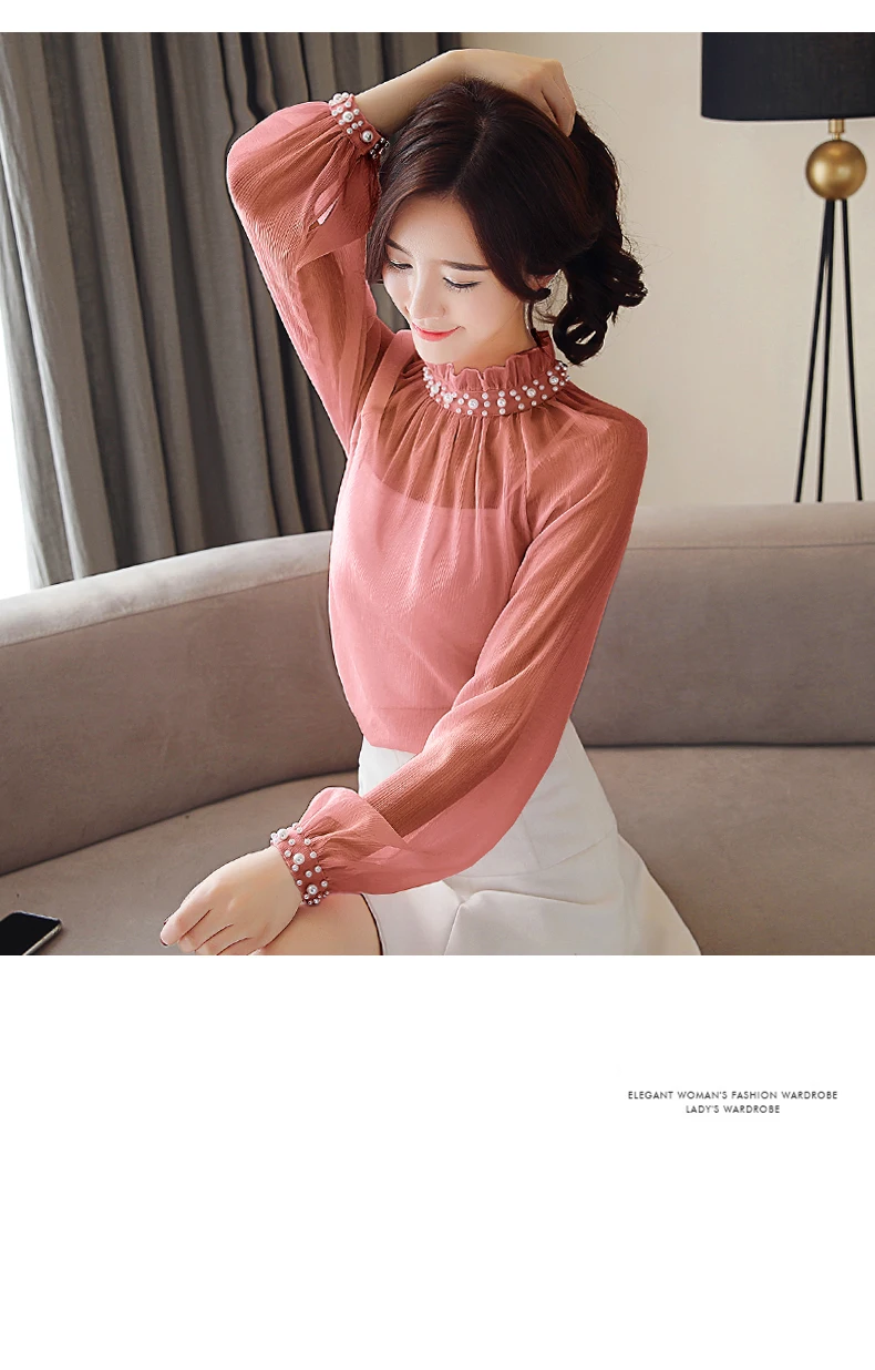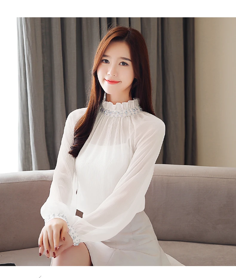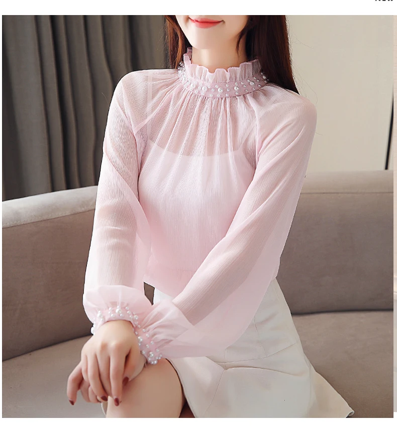 Женская шифоновая блузка с длинным рукавом, Весенняя блузка с кружевом, одежда с бисером