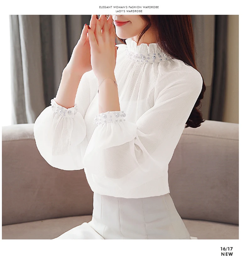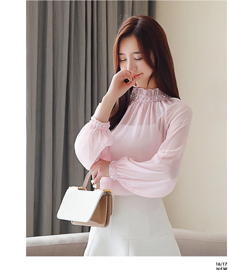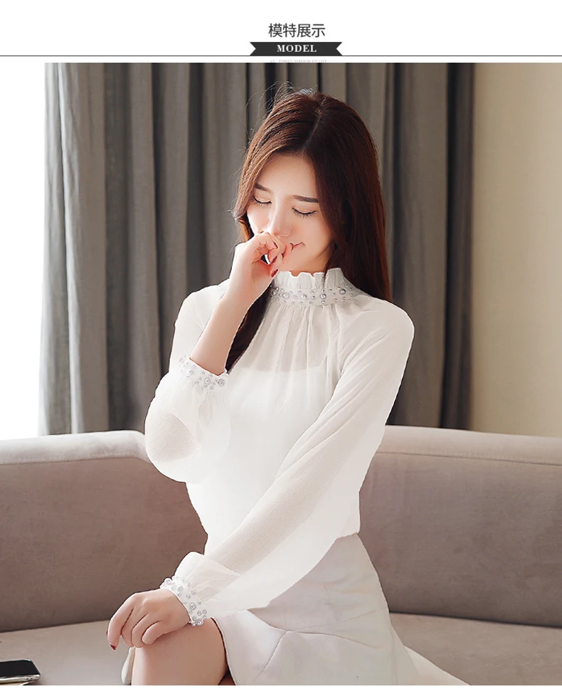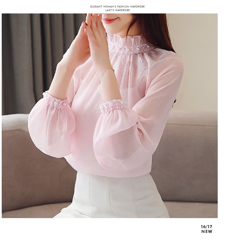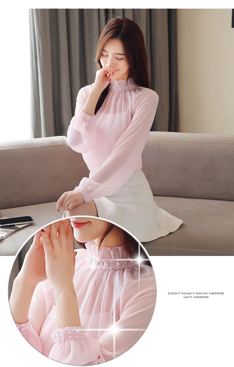 Женская шифоновая блузка с длинным рукавом, Весенняя блузка с кружевом, одежда с бисером