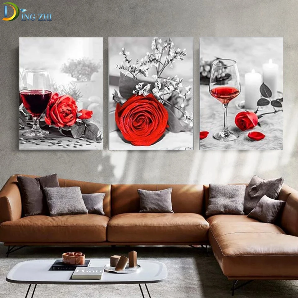 Скандинавские стены искусства черное и белое вино 5D DIY алмазная живопись Красная роза цветок полная дрель Триптих Алмазная мозаика вышивка подарок