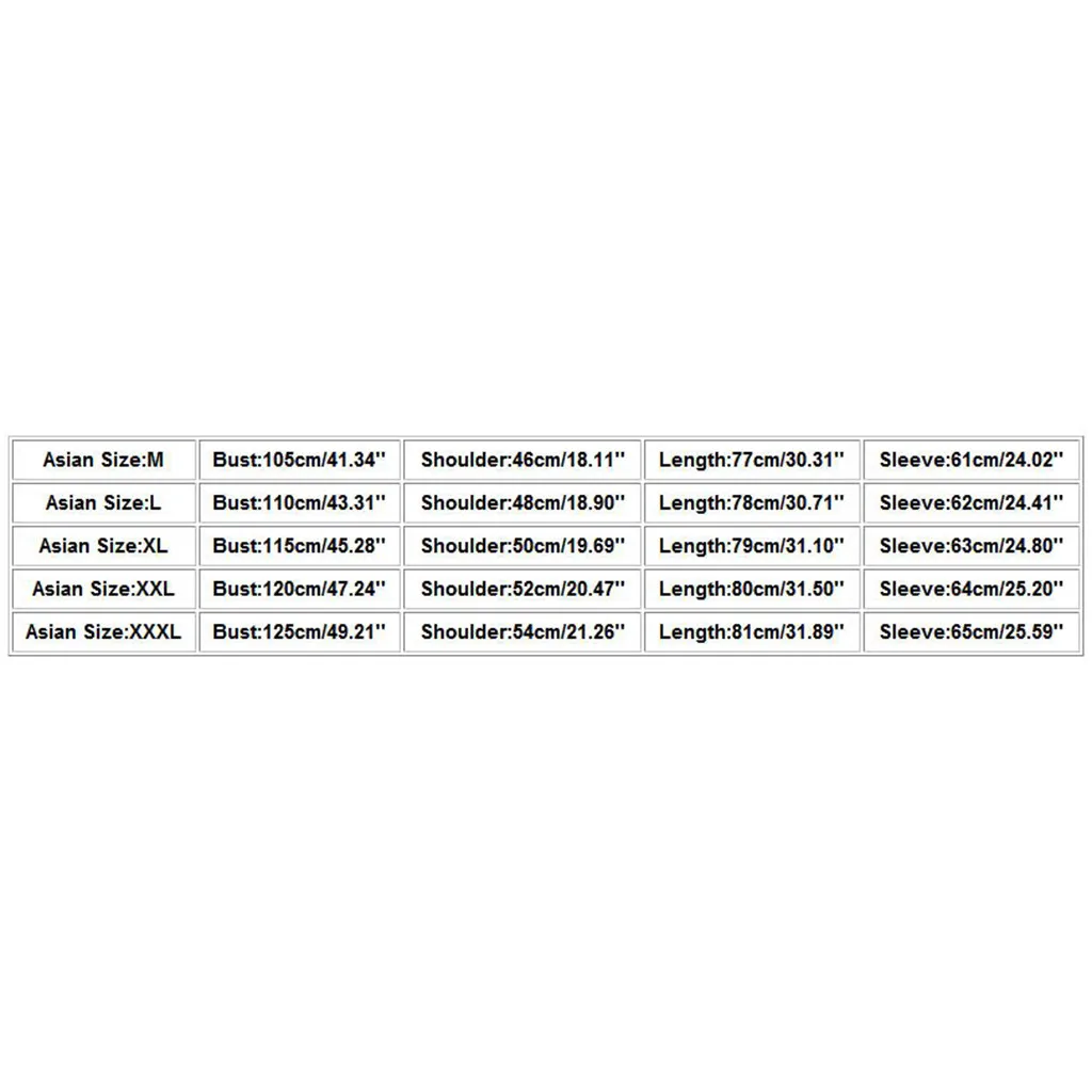 Азиатский размерБюстПлечоДлинаРукавМ105 см/41,34''46 см/18,11''77 см/30,31''61 см/24,02''L110 см/43,31''48 см/18,90''78 см/30,71''62 см/24,41''XL115 см/45,28''50 см/19,69''79 см/31,10''63 см/24,80''XXL120 см/47,24''52 см/20,47''80 см/31,50''64 см/25,20''XХХL125 см/49,21''54 см/21,26''81 см/31,89''65 см/25,59''