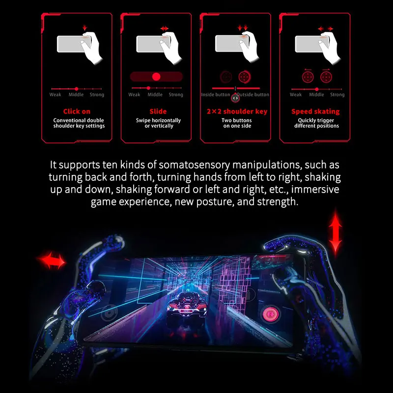Ультразвуковые AirTriggers 2X2 Плечевые кнопки, со своими тактильными отзывы, сравнимые с ручным игровым опытом. Односторонняя плечевая кнопка может быть переключена между одной кнопкой и двойной кнопкой, высокоуровневая работа, ожидая, когда вы появится. Существует также новая функция отображения жестов, которая значительно улучшает возможности воспроизведения.