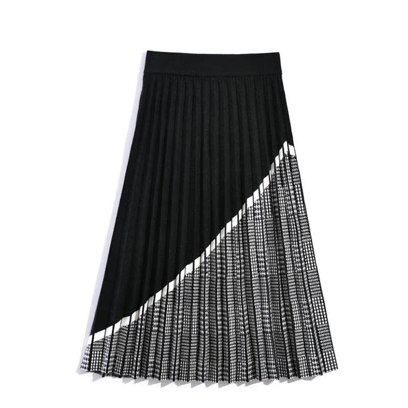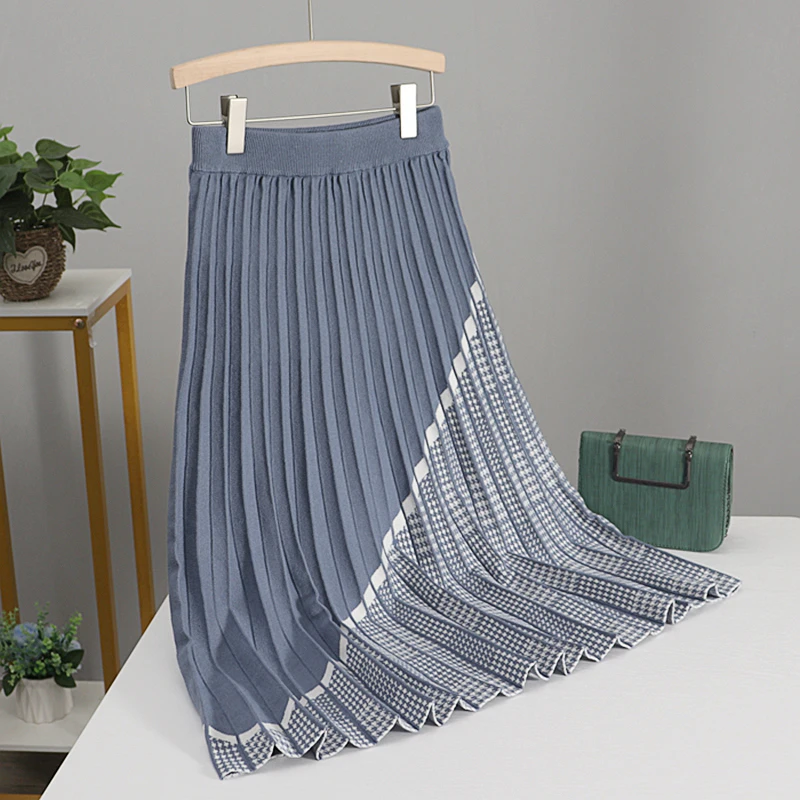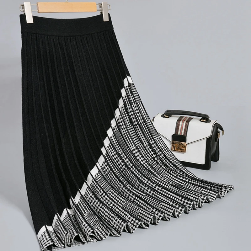 Женская длинная Плиссированная юбка-свитер, плотная вязаная клетчатая юбка средней длины с высокой талией и эластичным поясом, Осень-зима 2021