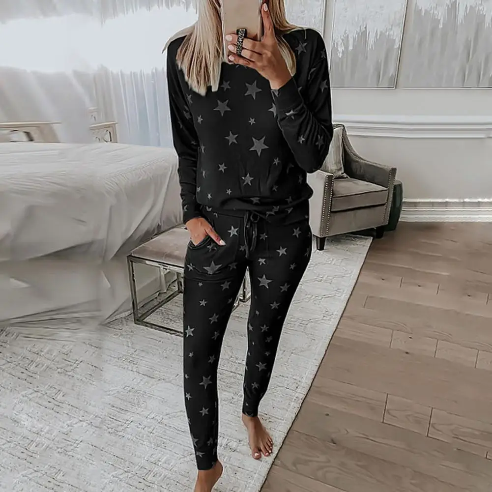 Женский пижамный комплект, Повседневная Домашняя одежда с принтом в виде милых звезд на осень и зиму, одежда для сна с длинным рукавом, натуральная Домашняя одежда, Ночной костюм