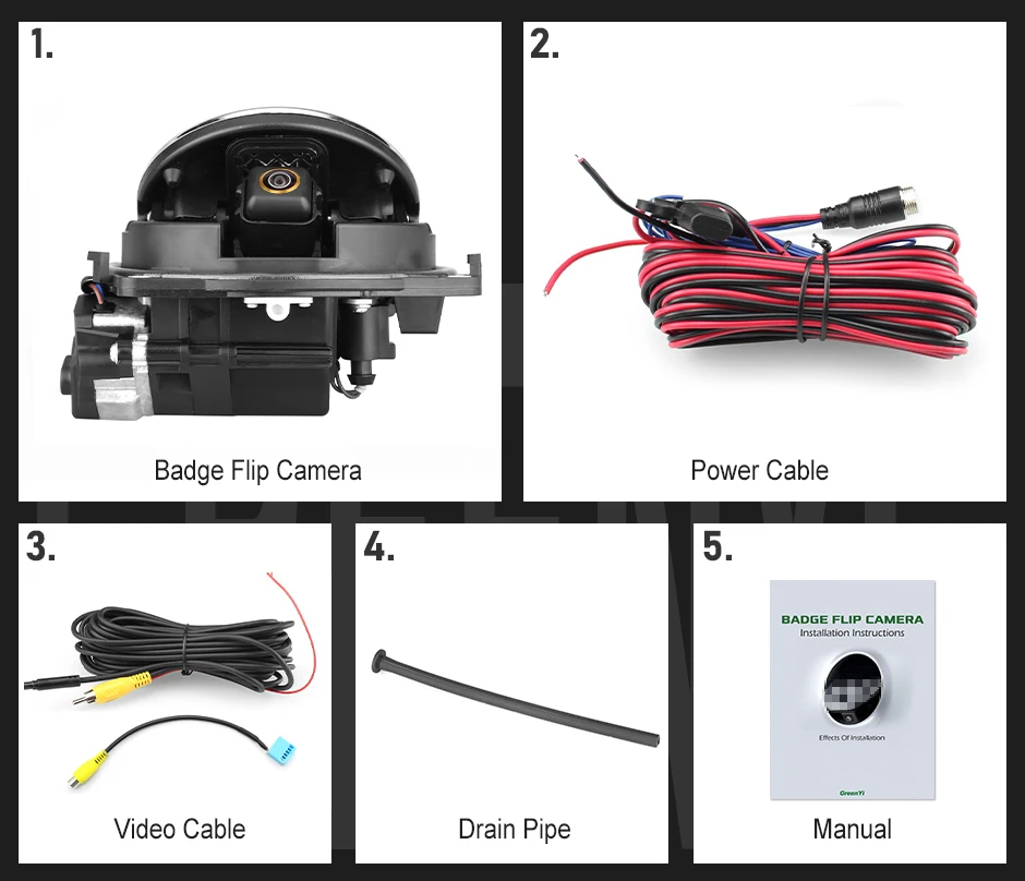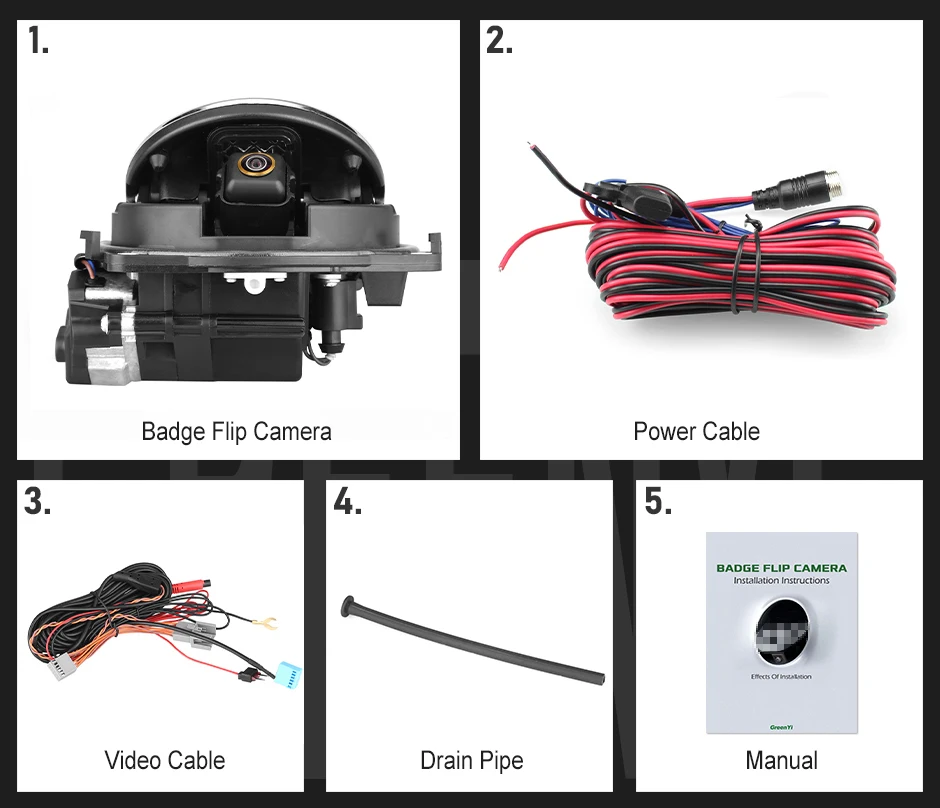 1. Флип-камера со значком2. Камера питания3. Видео кабель + RCA к MIB кабель4. Сливная труба5. Руководство пользователя