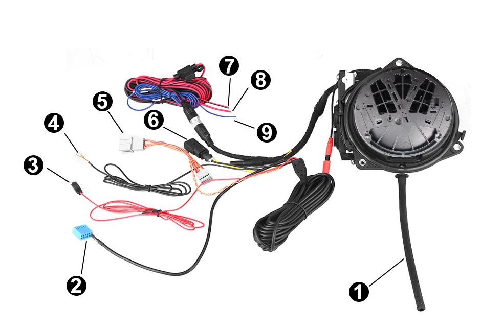 1. Сливная труба2. Разъем видеосигнала MIB3. ACC 12V +4. GND-5. Вилка провода CANBUS6. Переключатель багажника7. GND-8. Батарея 12V +9. Revesre светильник 12V +