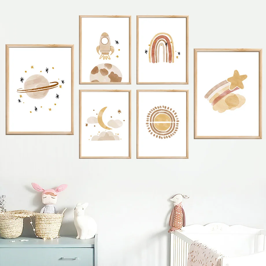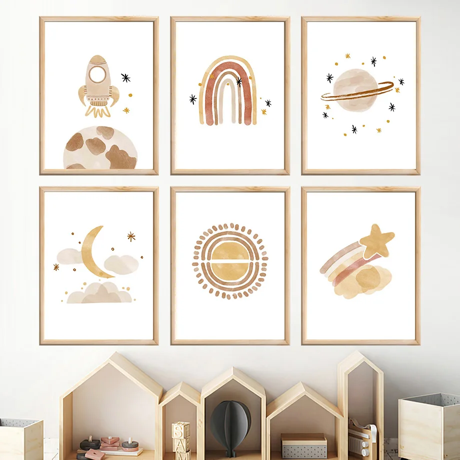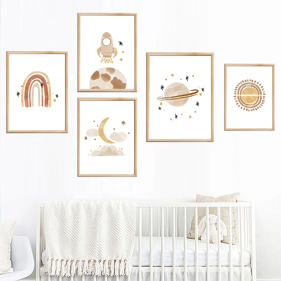 Мультяшная ракета земля Радуга пространство луна солнце детская настенная Картина на холсте скандинавские постеры и искусство детской комнаты декор