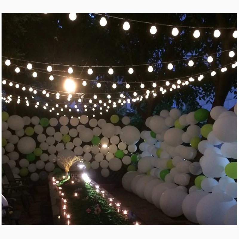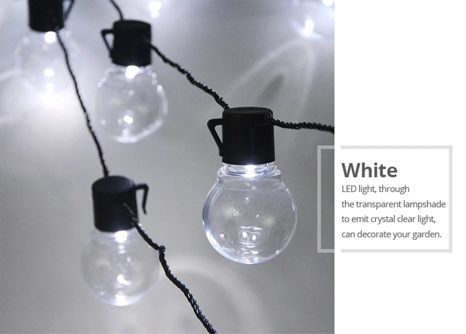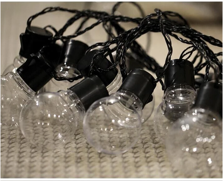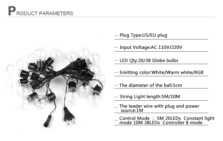 Идеально подходит для наружных патио, палуб, свадеб, дней рождения, праздников и других мероприятий. Они идеально подходят для добавления уютной атмосферы или очаровательного и праздничного акцента к повседневному вечеру под звездами. Спецификация: Диаметр лампы: 5 см Пространство между двумя лампами: 25 см Длина от штекера до первой лампы: 0,75 м Длина провода с светодиодный лампы: 9,3 м Общая длина: 2,5 m/6m/10m Обратите внимание: 6 м-5 м провод лампы + 1 м провод ЕС/США Цвет кабеля: черный Цвет глобуса: прозрачный чехол Светодиодный Кол-во каждой лампы: 1 шт. DIP СВЕТОДИОДНЫЙ Кол-во лампы: 10/20/38 Мощность: около 4 Вт Материал лампы: поликарбонат Водонепроницаемость: Да (IP44) Вход: 110 В до 240 В основная мощность Подключение: Да (вы можете подключить 10 шт. струнный светильник вместе, которые имеют в общей сложности 100 метров вместе) Штепсельная Вилка: штепсельная вилка стандарта США/штепсельная вилка европейского стандарта/штепсельная Вилка USB Применение: для использования в помещении/на открытом воздухе