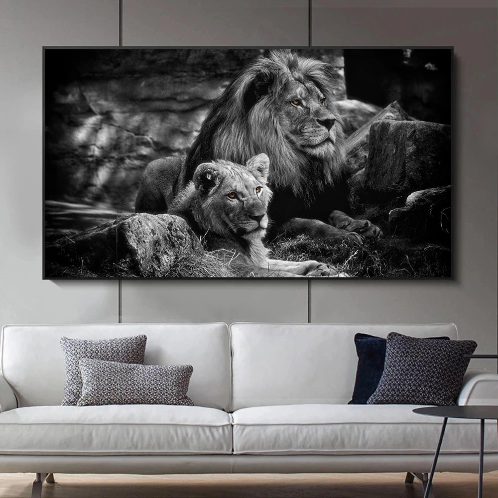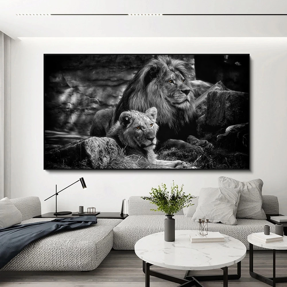 Черно-белая Картина на холсте с изображением пары Львов современное...