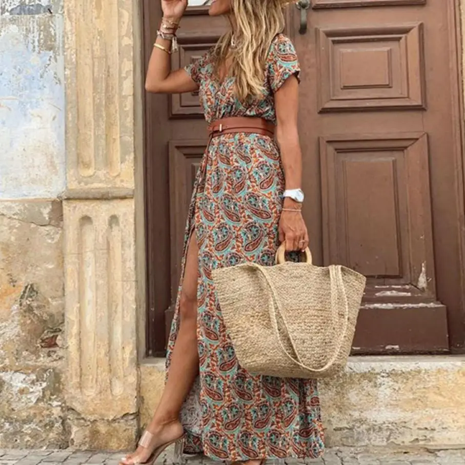 Платье-Макси женское с коротким рукавом, пляжный сарафан с ремнем Пейсли, повседневный элегантный наряд в ретро стиле, на лето