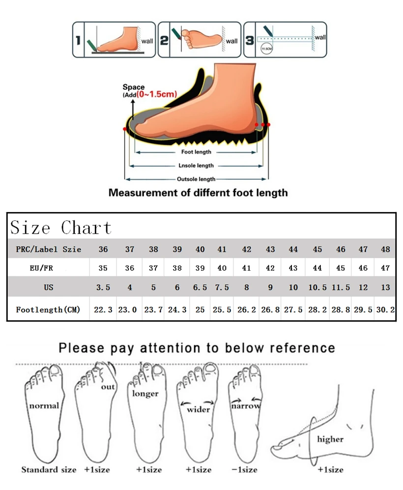 Уважаемый покупатель, размер этикетки-китайский размер, который отличается от стандартного Европейского или американского размера. Например: размер этикетки 42 = стандарт ЕС 41 = стандарт США 8. Перед покупкой ознакомьтесь с таблицей размеров. Если вы все еще не знаете, как выбрать, пожалуйста, Измерьте длину вашей стопы (не измеряйте длину стельки, не смотрите длину стопы, указанную на вашей обуви). Затем свяжитесь с нами.