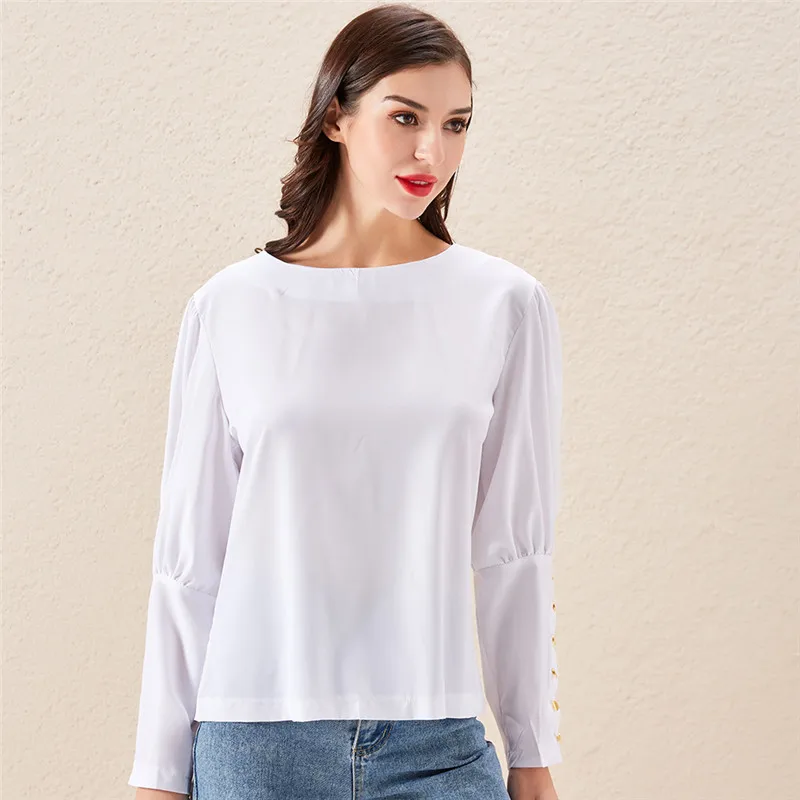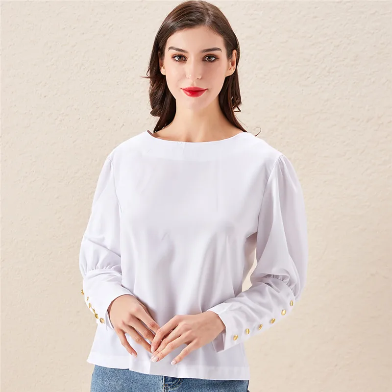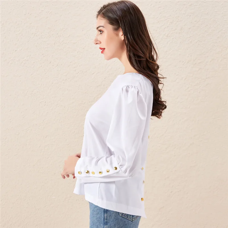Женская блузка с пышными плечами, элегантная офисная Осенняя блузка с металлическими пуговицами, топы с длинным рукавом