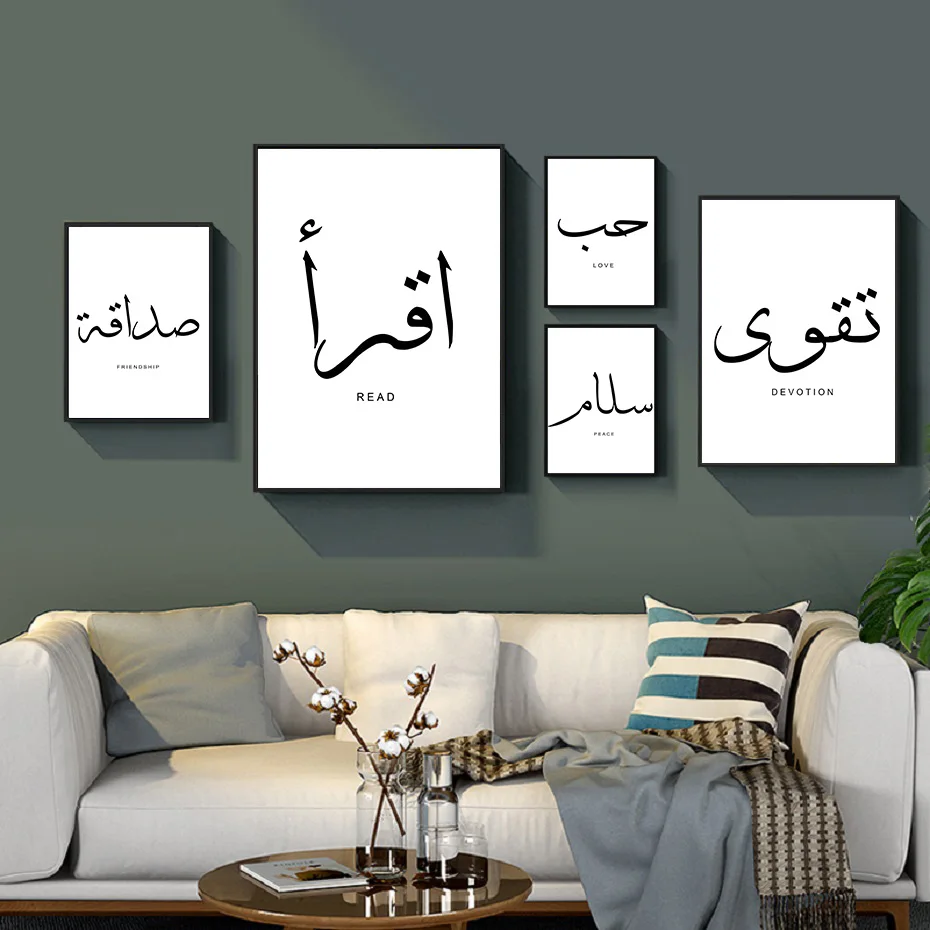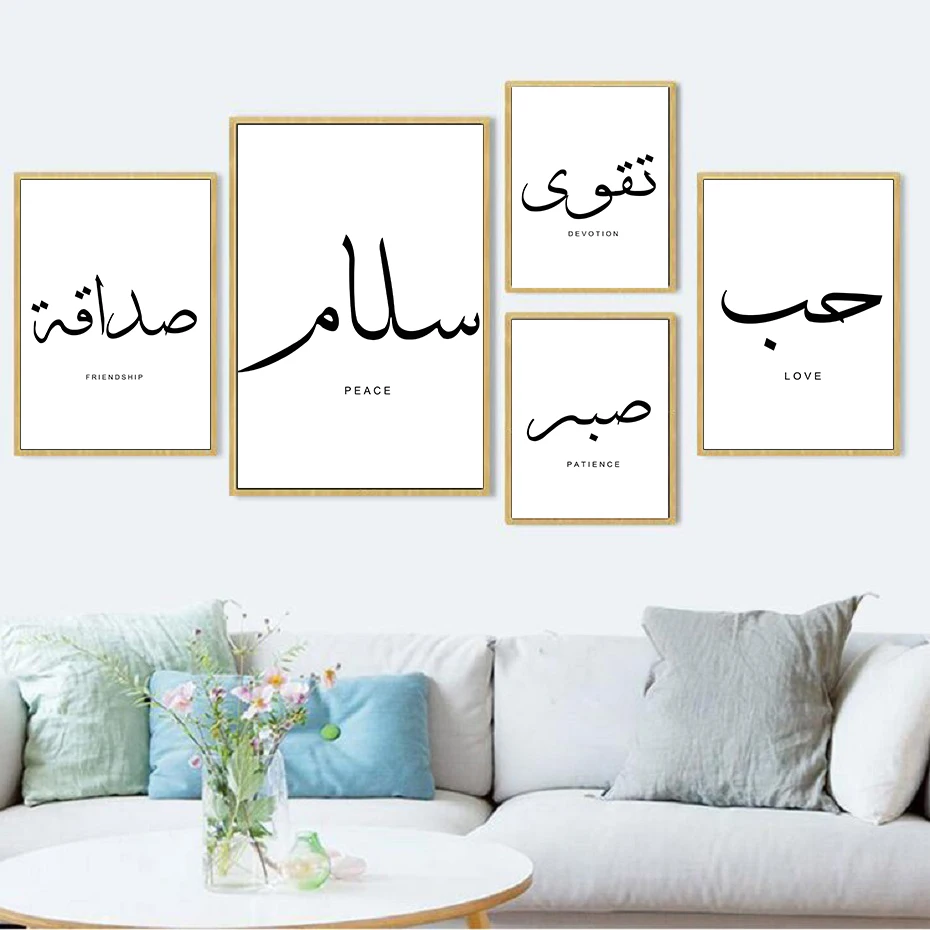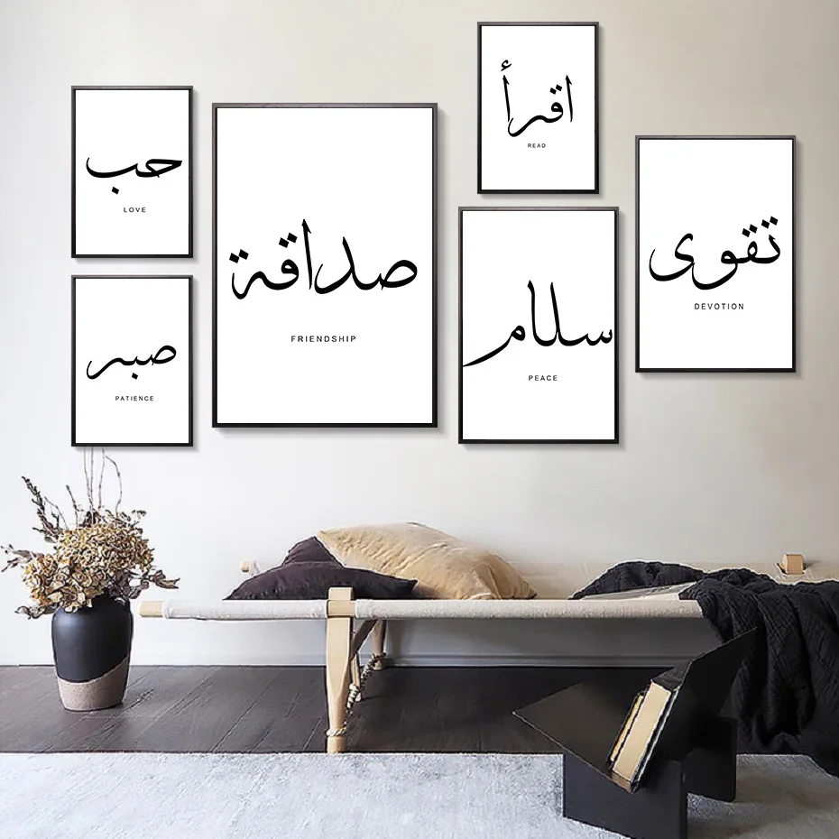 Черно-белая мусульманская настенная печать мира, любви, чтение, арабская каллиграфия, плакат, цитаты, холст, живопись для гостиной, домашний декор
