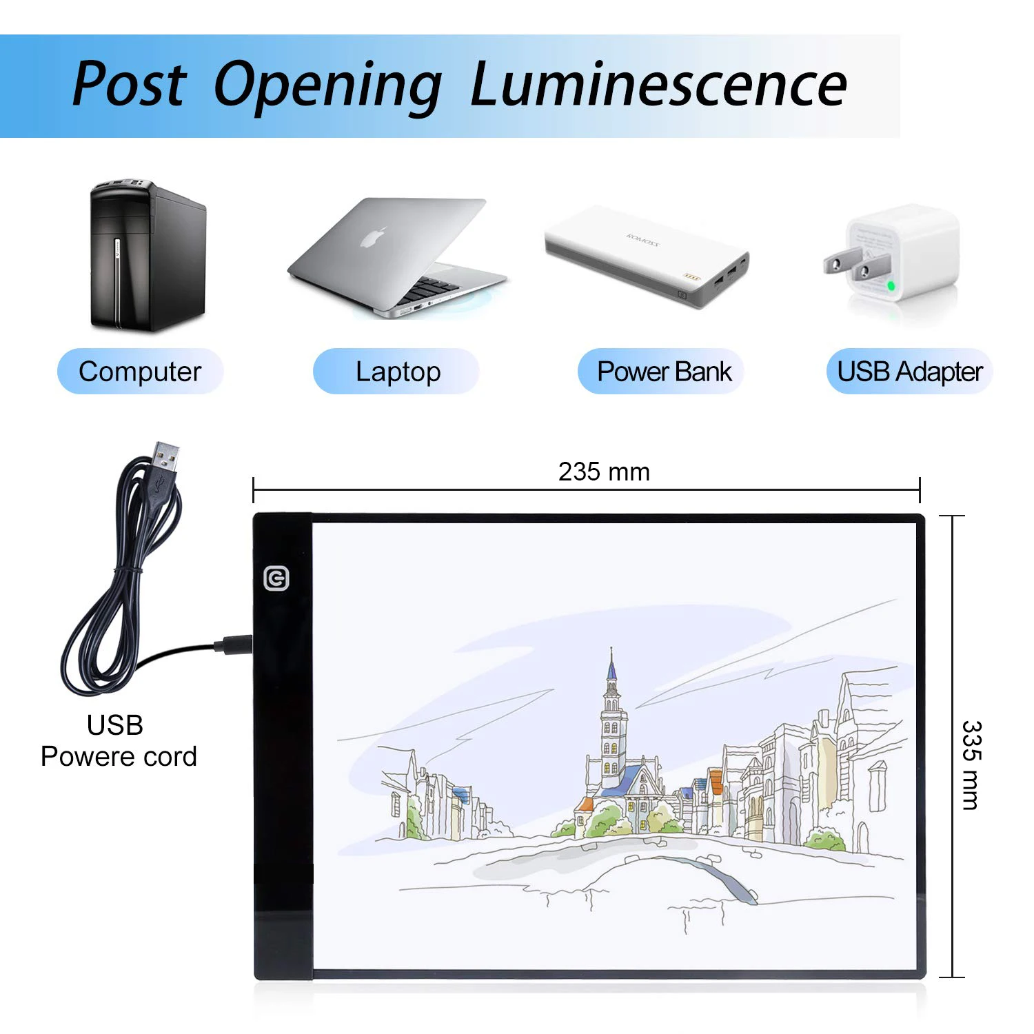 Трехуровневая Регулируемая яркость, вы можете выбрать различную яркость в соответствии с вашими потребностями, простой и простой в эксплуатации. Светильник Tracer питается от usb-шнура питания и может быть подключен к компьютеру, мобильному питанию, адаптеру и т. д., что очень удобно. Прозрачная Акриловая поверхность имеет более высокий светильник, что обеспечивает четкость изображения и удобство отслеживания.Этот светодиодный светильник широко используется в 2D анимациях, каллиграфии, дизайне рисунка, воспроизведении изображений, просмотре рентгеновских фильмов, производстве алмазных картин, производстве цветных картин и т. д. Посылка включает в себя светодиодный светильник с отслеживанием коробки, ЖК-печатную плату, кабель питания UBS, Два пластиковых зажима и набор исчезающих ручек. Я надеюсь, что этот продукт удовлетворит Вас.