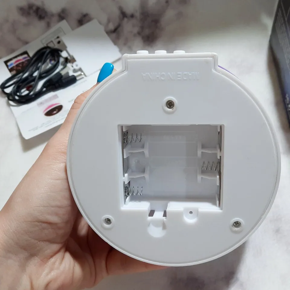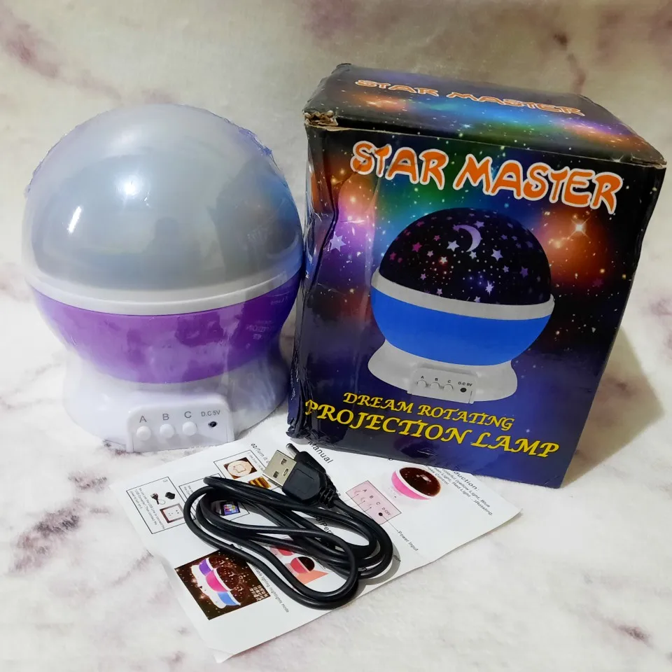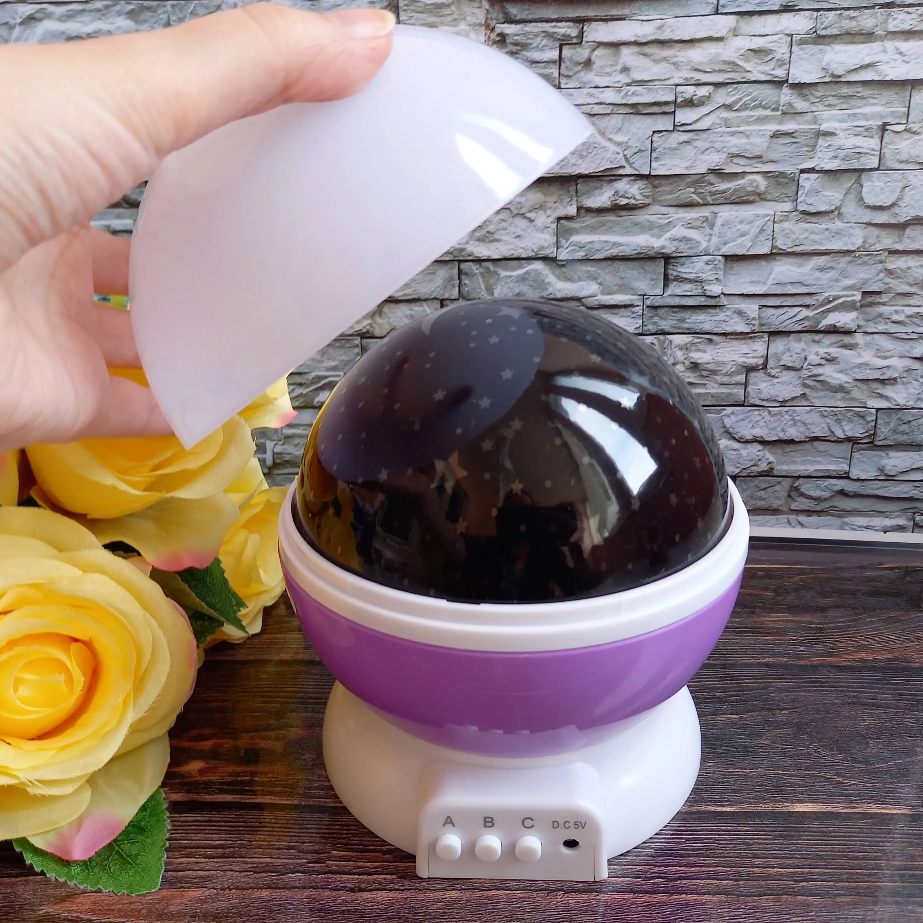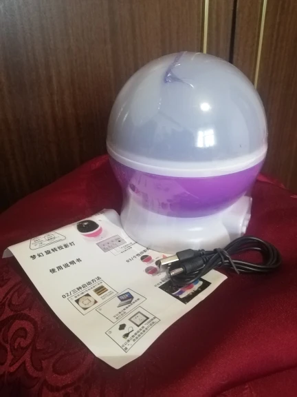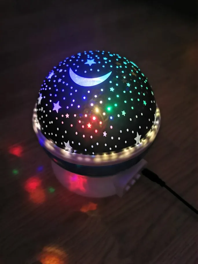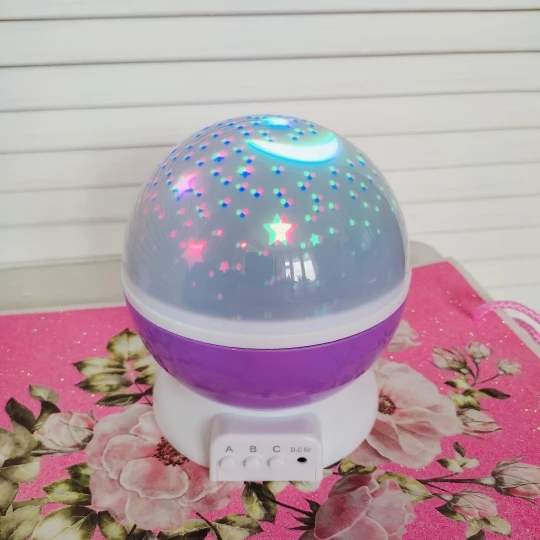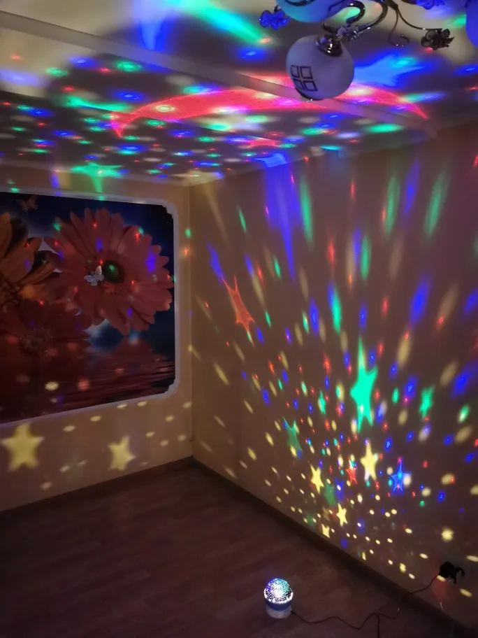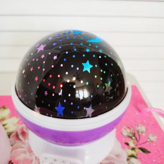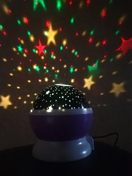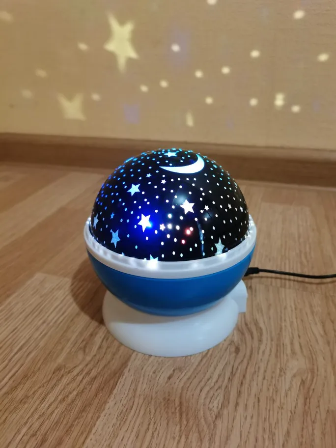Проектор приехал в немного помятой коробке.но сам не пострадал . в комплекте с проектором есть USB кабель и инструкция. Проектор-ночник представляет собой шар на подставке,с 3-мя кнопками переключения и одним USB входом. На нижней панели имеется слот для 3-х пальчиковых батареек ,они в комплект не входят. Проектор переключается в разные цвета,которые можно смешивать с помощью переключения режимов,также можно добавить вращение шара и мерцание звёзд. У проектора есть защитный купол из матового оргстекла,который делает свет размытым,я использую его как ночник,свет через купол получается приглушенный и не мешает ребенку спать с ним. Мой проектор в виде звёздного неба, с ним в комнате становится красиво как в сказке,ребенку нравится. Покупкой довольна и смело рекомендую.