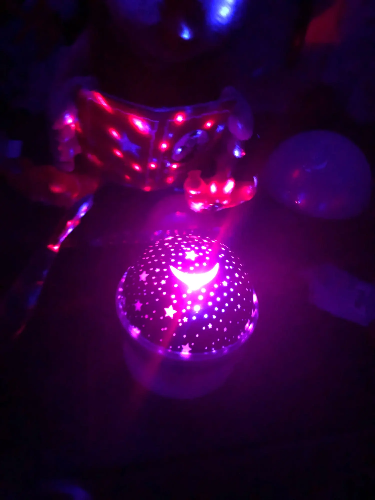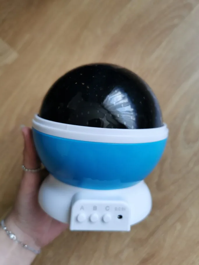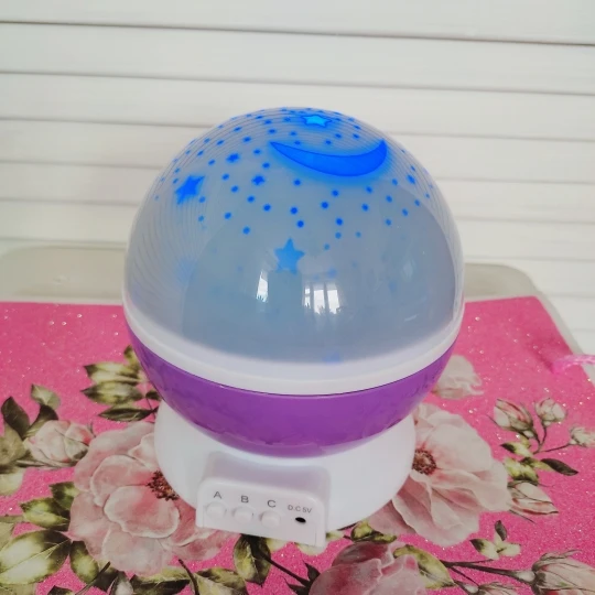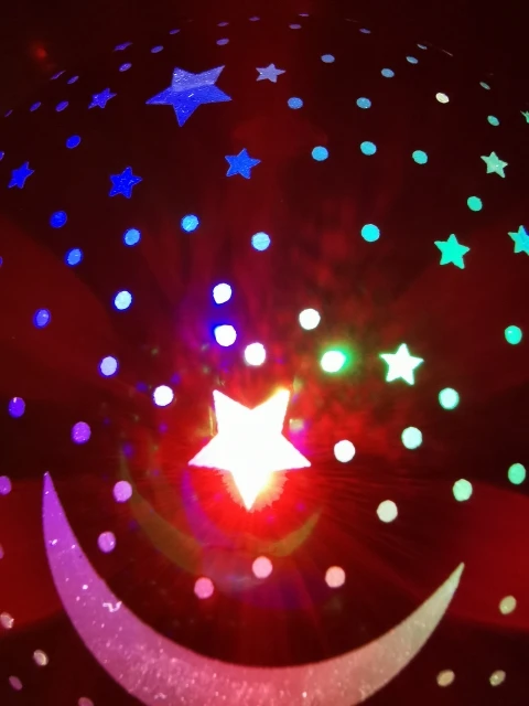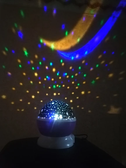 Очень красивый ночник. Проектор с детскими звездами и лунами. Приехал в коробочке, упаковка была прекраснейшей, всё пупыркой обмотано. Прилагается краткая инструкция и провод. Проектор может работать и от пальчиковых батареек, в комплект не входят, зато от провода всё замечательно. Есть 3 кнопки, которыми можно управлять работой проектора. Можно переключать режимы, цветовую гамму, можно комбинировать их всячески. Так же можно полностью отключить движение сферы и будет непрерывное свечение, либо сделать его мигающим. Это не только очень красиво, но и действует успокаивающе. Отличный подарок любому ребенку! Доставка до МО 2 недели.
