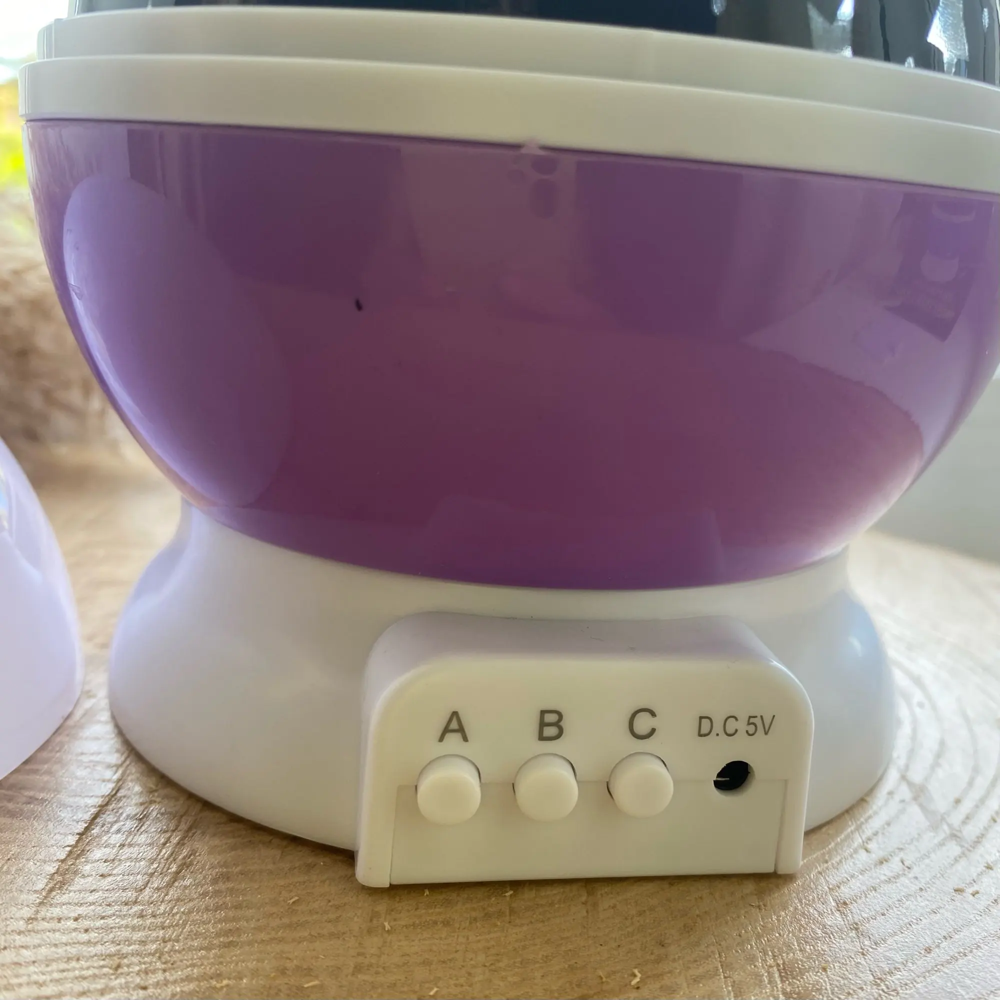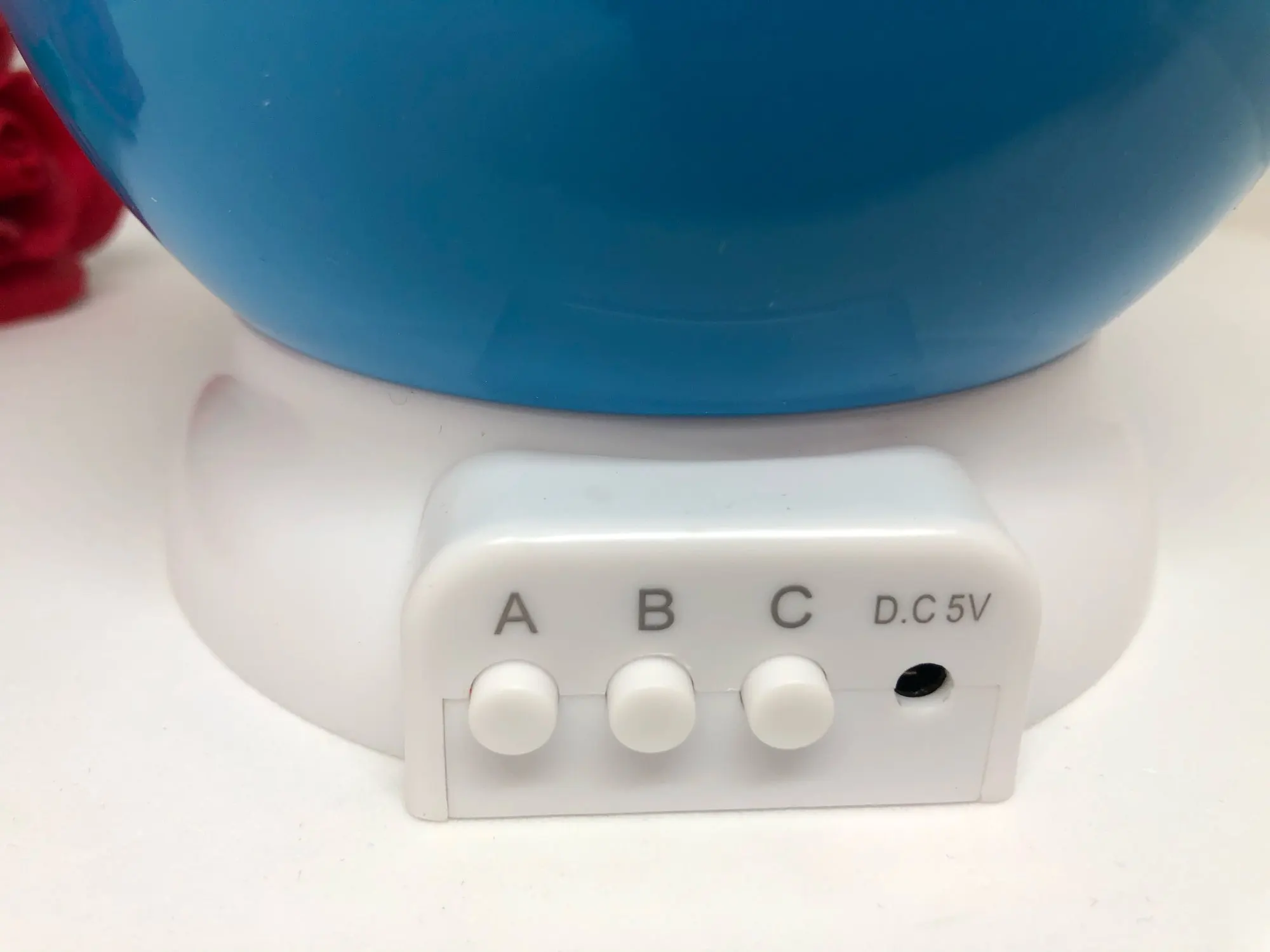 Упакован ночник в коробочку, которая за время транспортировки немного помялась, на ночник этот момент никак не повлиял. Ночник был запаян в пленку, в комплекте шел провод и инструкция.Все функции ночника заложены в 3 кнопках. Кнопка А включает проектор, добавляет яркость, переключает режимы (ночник может просто светить, может моргать) Кнопка В переключает цвета (цвета есть однотонные это синий, белый, зеленый, красный, так и разноцветные от 2 до 3 разных оттенков как выберите) Кнопка С включает и выключает вращение. Вообще варианты режимов и смешивания цветов разнообразны, мы хотели посчитать сколько же их всего, а потом решили, зачем оно нам пусть это для нас пока останется секретом.Светит ночник очень ярко и красиво, фотографии не могут передать всей красоты.