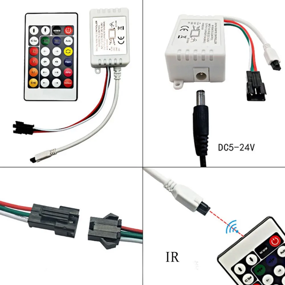 Одиночный wwwire выходной сигнал, поддерживает нормальный Ink1003,ucs1903,tm1804,ws2811,WS2812B и т. Д.Встроенный до 200 программ для пользователейВыбираемые светодиодные пиксели для управления (1-1000)Поддержка ИК-пульта дистанционного управления, Контроль расстояния до 15 метров
