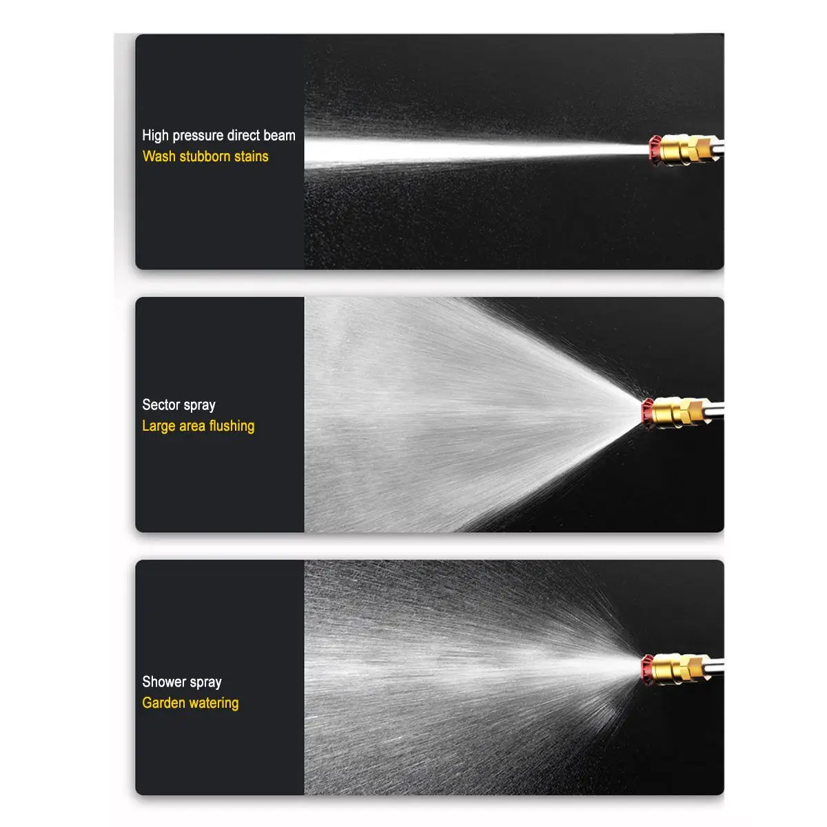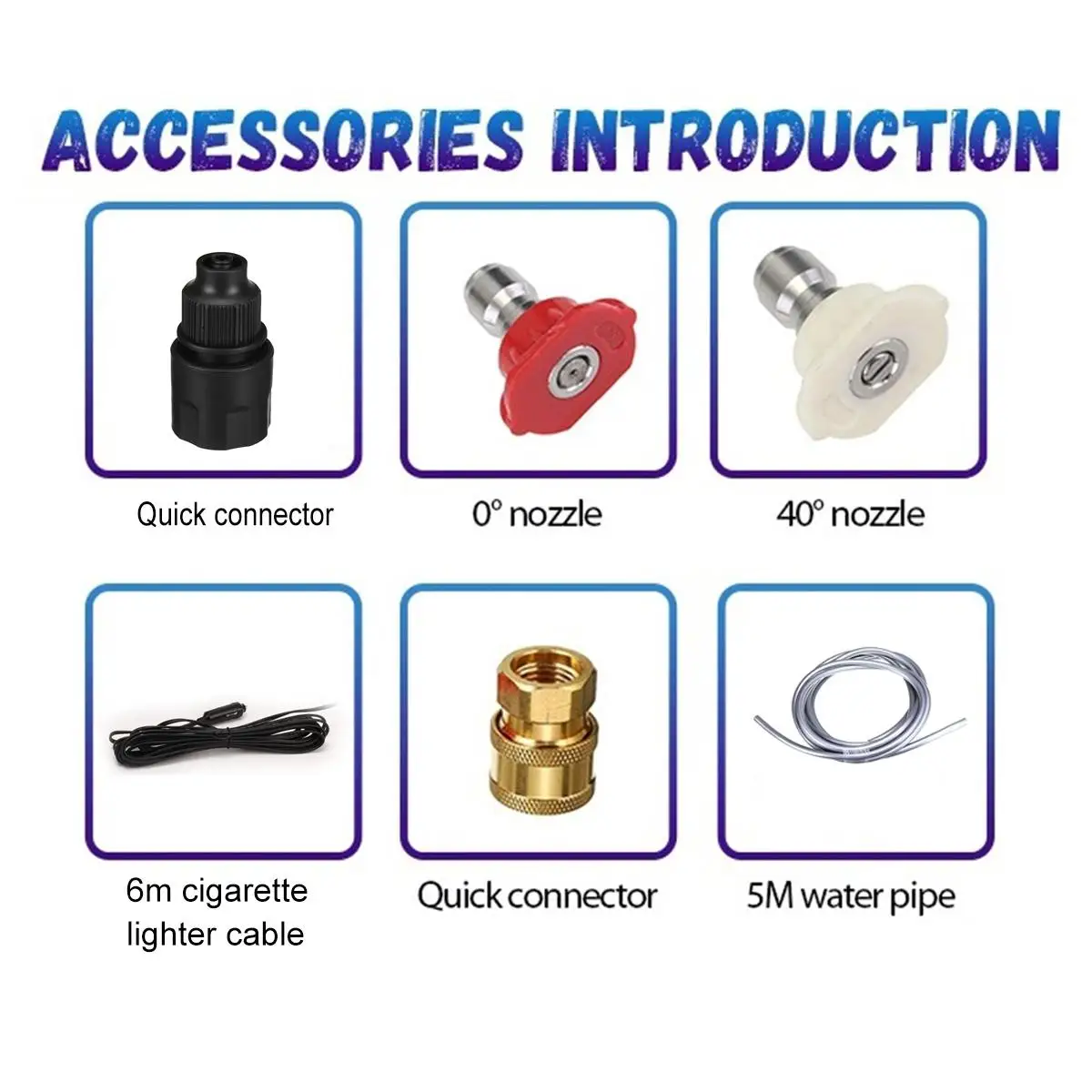 Посылка входит:1 x автомойка1 x быстрый разъем1x5 м водопроводная труба1x6 м кабель прикуривателя1 x насадка 0 °1x40 ° сопло1 Руководство по внедрению