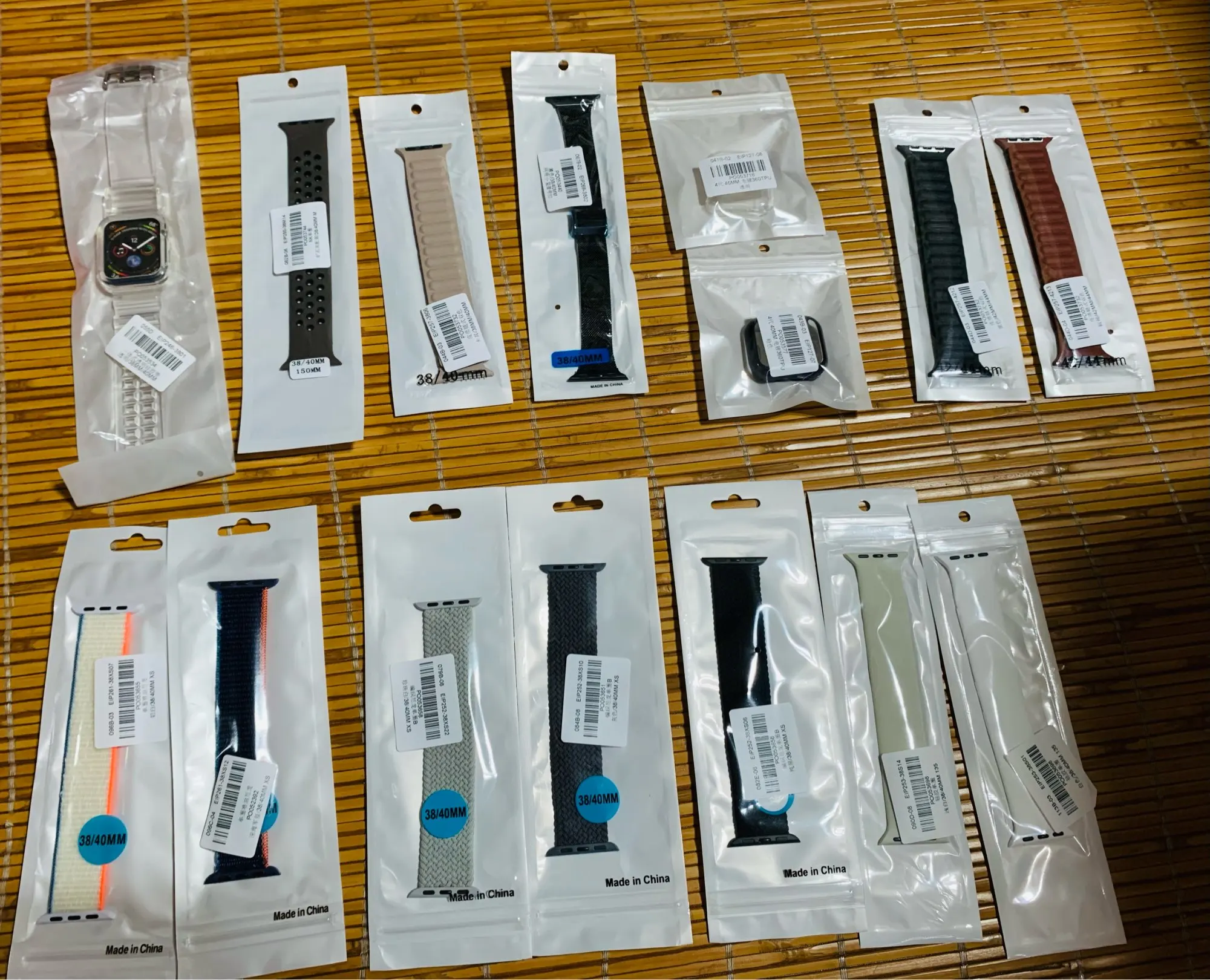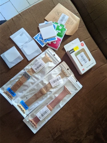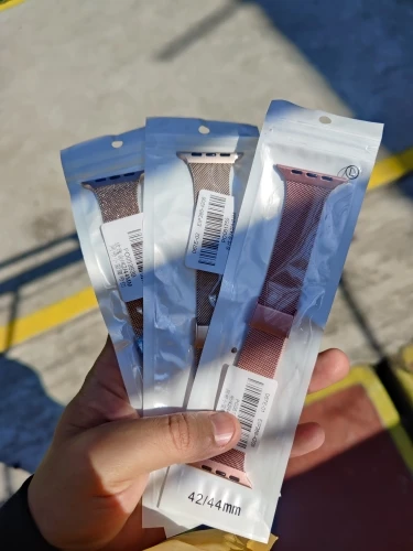 Металлические браслеты в пленках, нет царапин, тряпичный браслет тоже «на отлично», нитки нигде не торчат. Рекомендую продавца. Доставка недели две до Минска, не больше.
