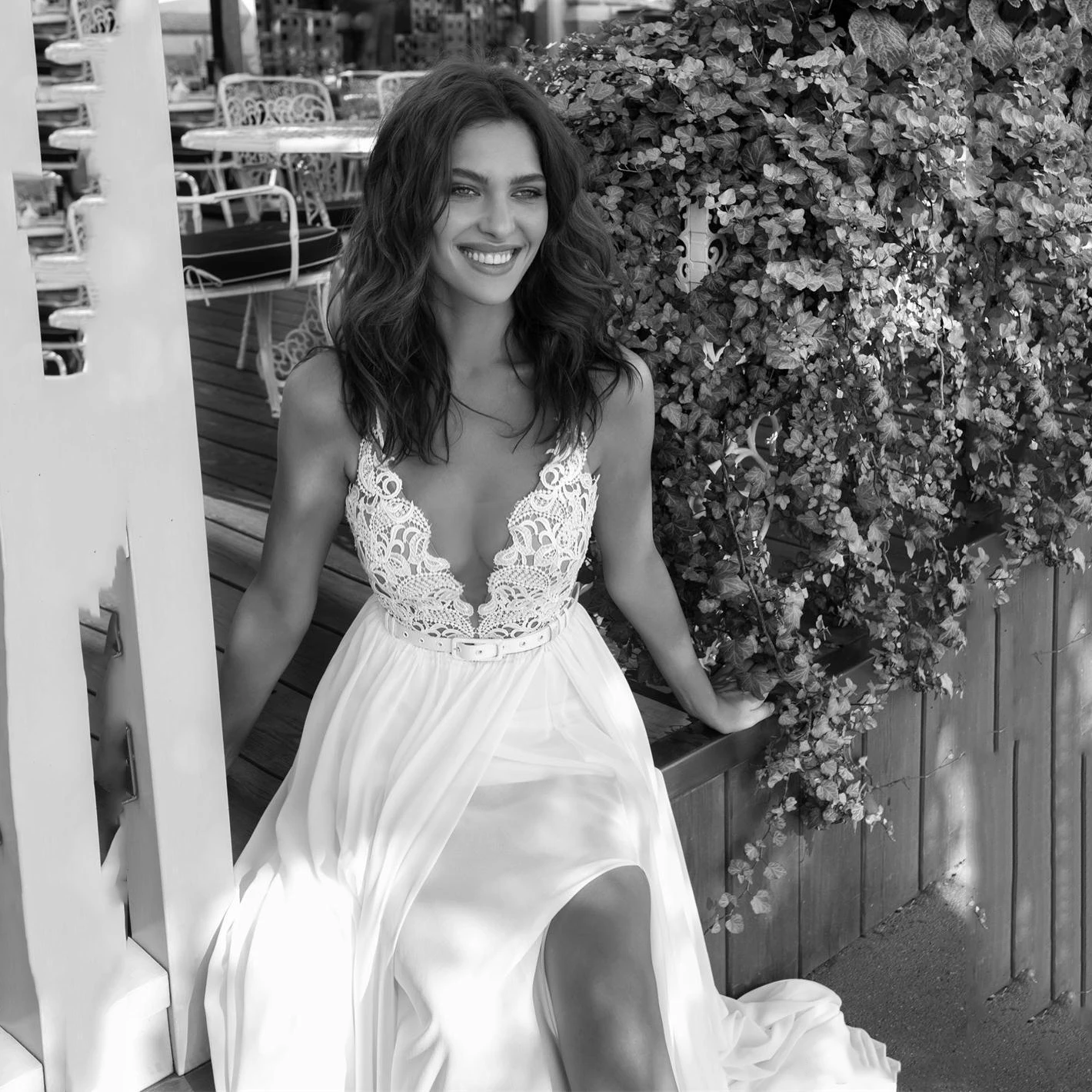 Сексуальные пляжные свадебные платья 2021 глубокий v-образный вырез боковая часть Сплит Топ Кружева Свадебные платья шифон открытая спина Бохо свадебное платье Robe De Mariee