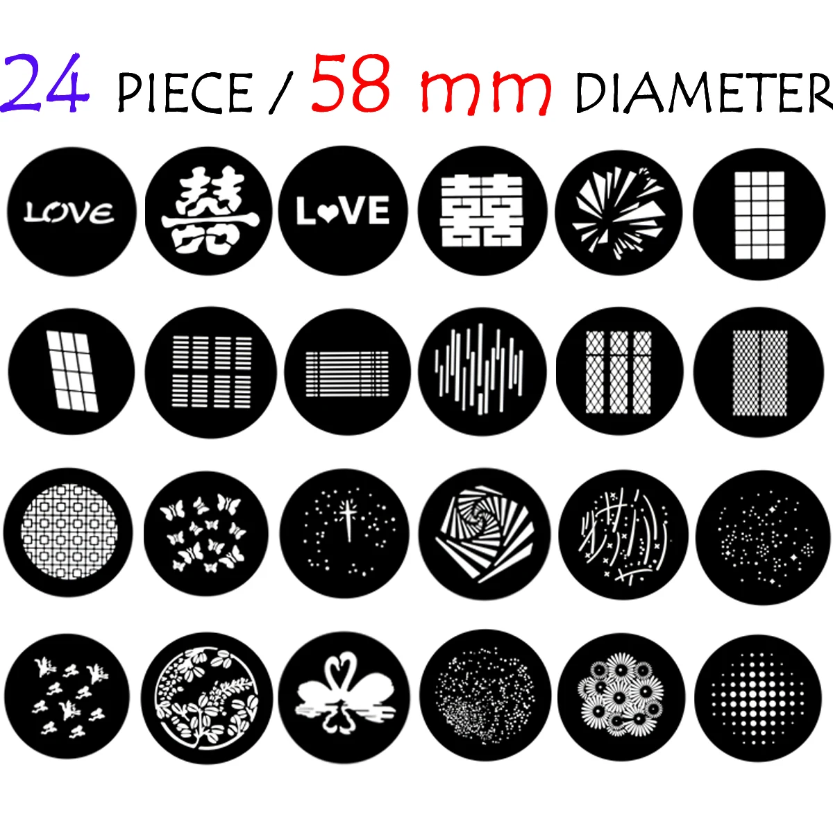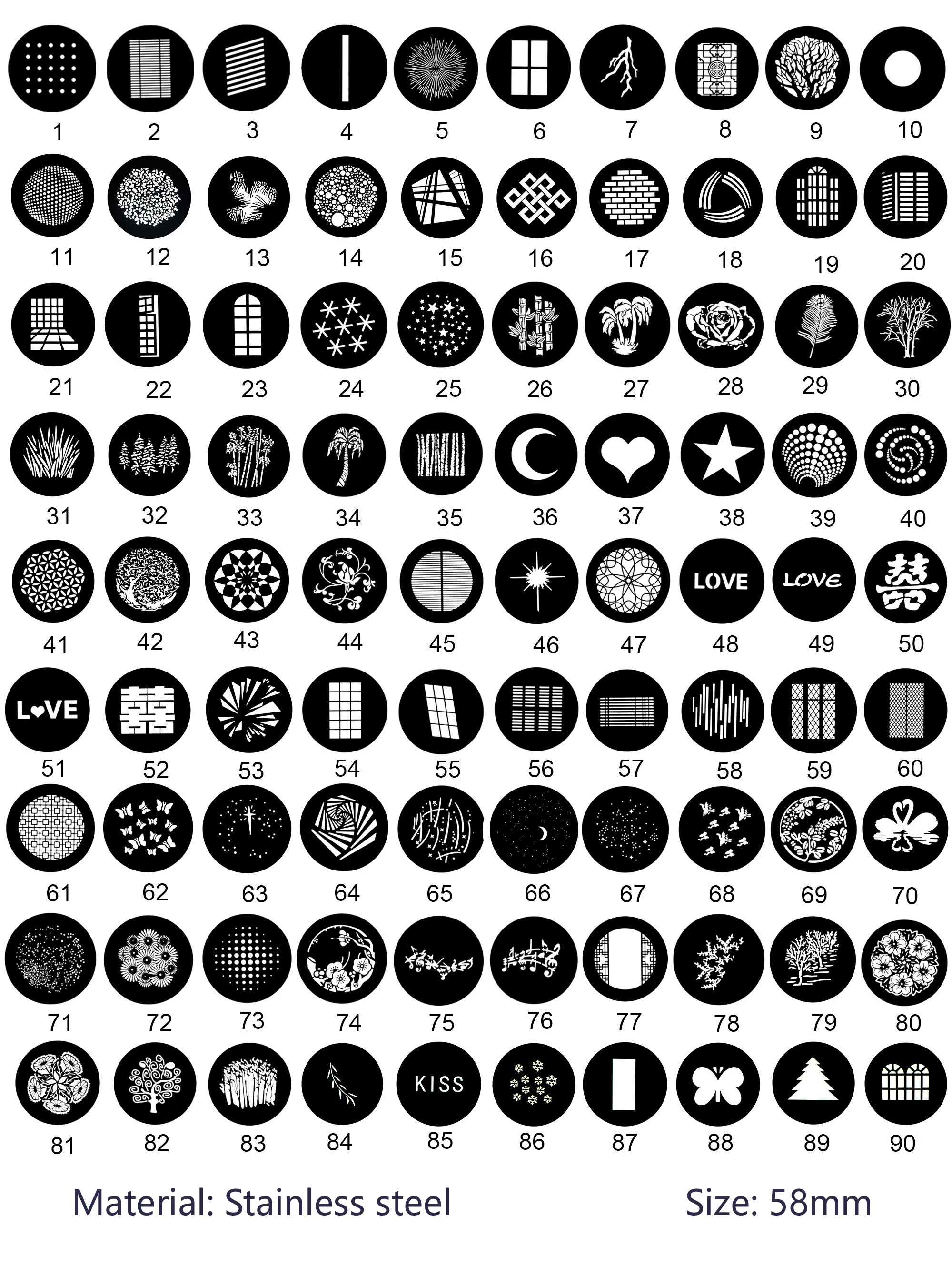 Эта серия 58 мм GOBO, с первых 1-24 штук, расширена до более поздних 46 штук, затем до более поздних 83 штук, и теперь она увеличена до 90 штук. Она неотделима от поддержки покупателей. Спасибо новым и старым клиентам, мы постараемся сделать все возможное, чтобы разработать больше и лучше моделей для всех на выбор, спасибо!