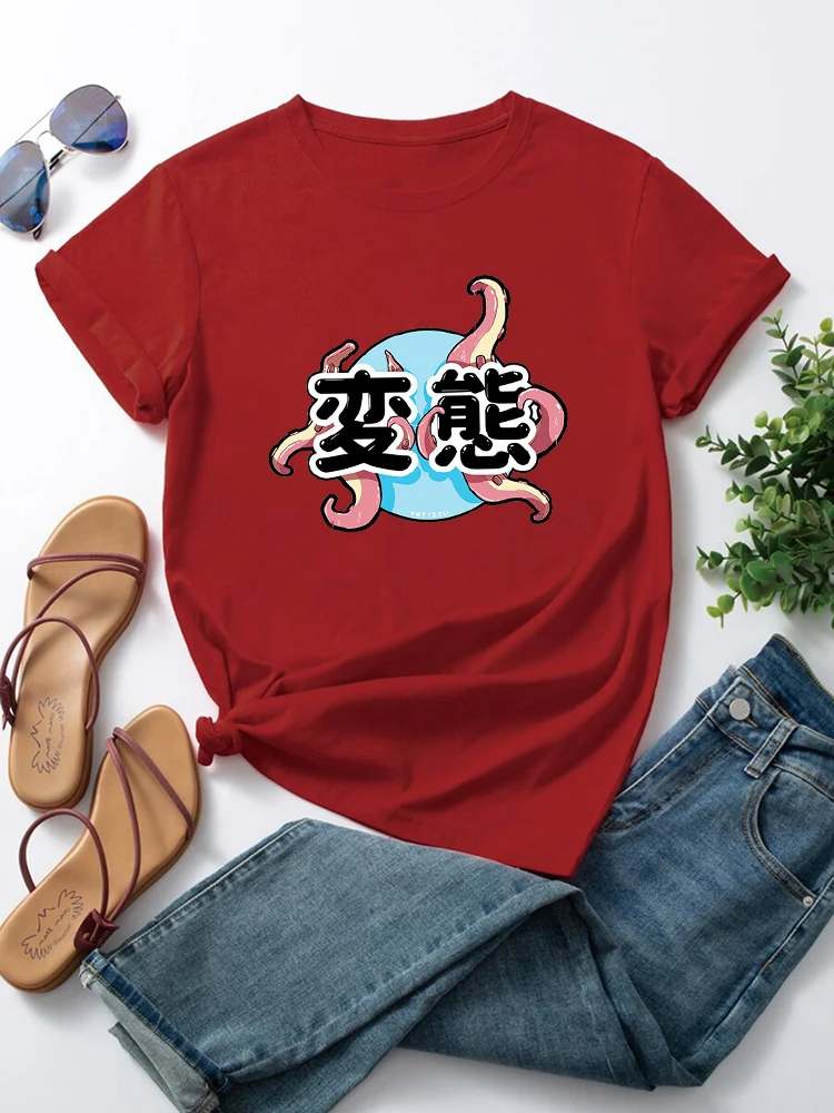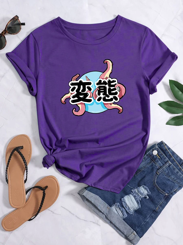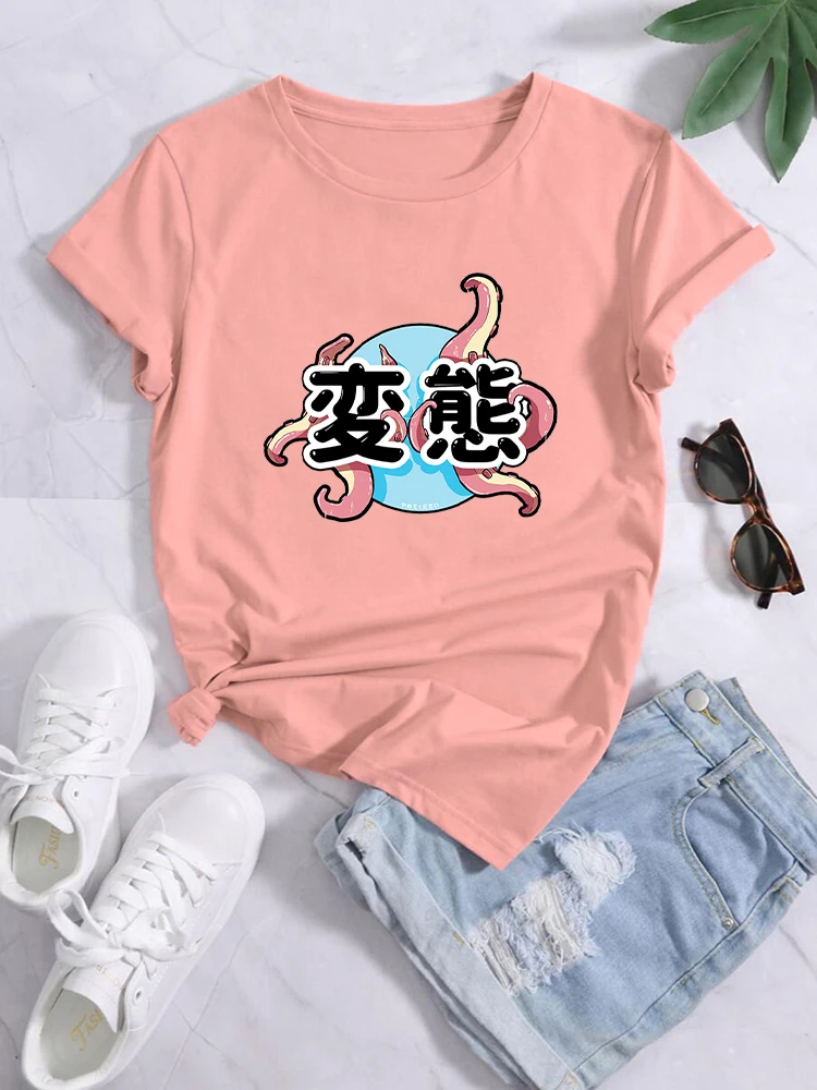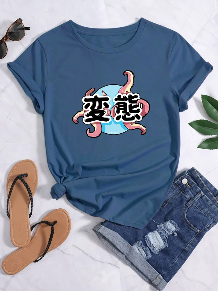 Футболка женская летняя дышащая с круглым вырезом и принтом в виде щупальцев