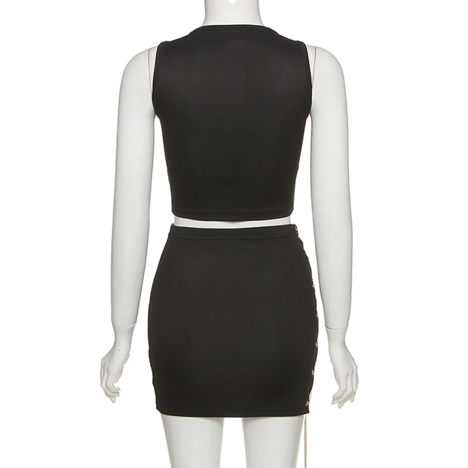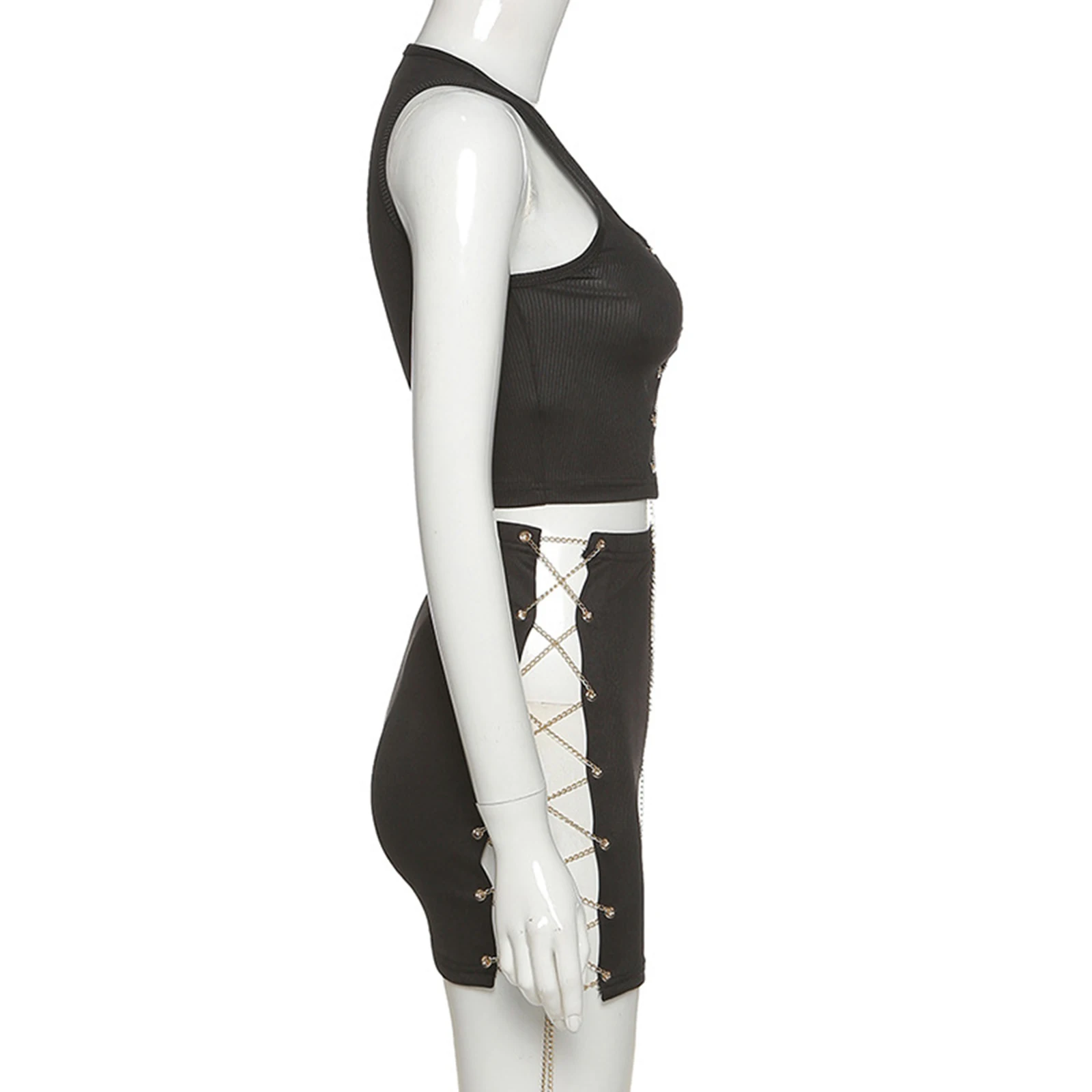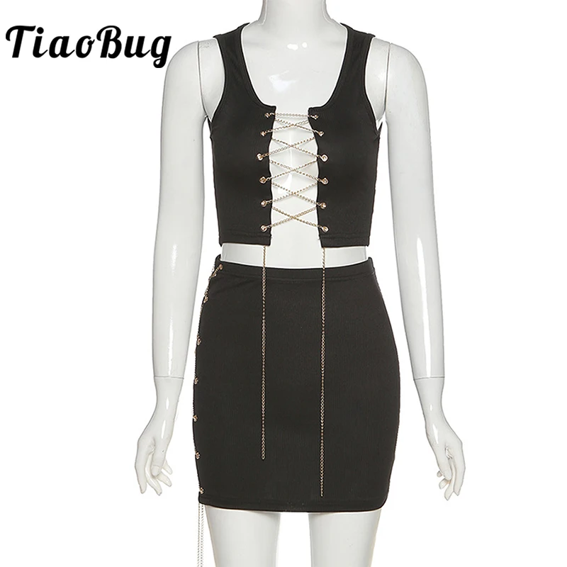 Сексуальный комплект из двух частей для женщин Летняя одежда мини-юбка с металлическими цепочками и на шнуровке; Сандалии с вырезами укороченный топ на бретелях, жилет, фестивальный рейв Клубная одежда