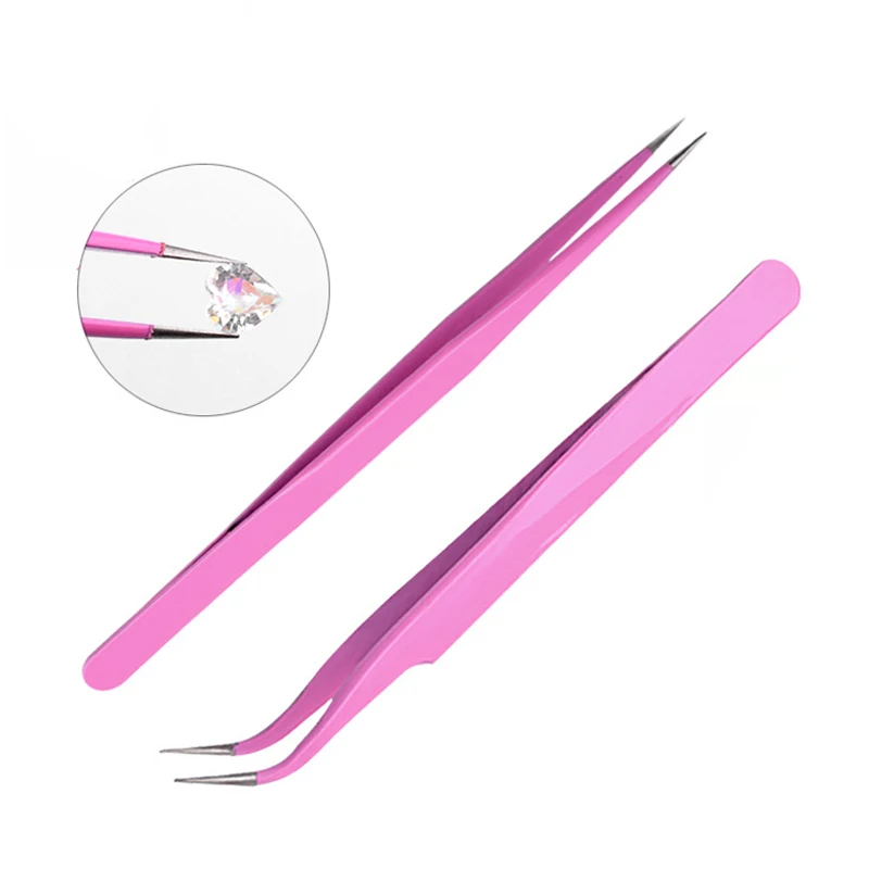 Пинцет розовый 2 шт.компл. стразы из нержавеющей стали, прямой изог...