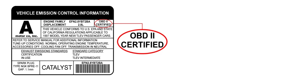 YA201-диагностический сканер, работающий на основе установленных OBD-II протоколов:ISO15765-4 (CAN)ISO14230-4 (Протокол ключевого слова 2000)ISO9141-2 (Азиатские, европейские, Chrysler ТРАНСПОРТНЫЕ СРЕДСТВА)J1850 VPW (GM транспортные средства)J1850 ШИМ (автомобили Ford)Если вы не уверены, посмотрите под капот и попробуйте найти ярлык, в котором четко указано, что транспортное средство предназначено для соответствия OBD-II законам, как показано ниже.
