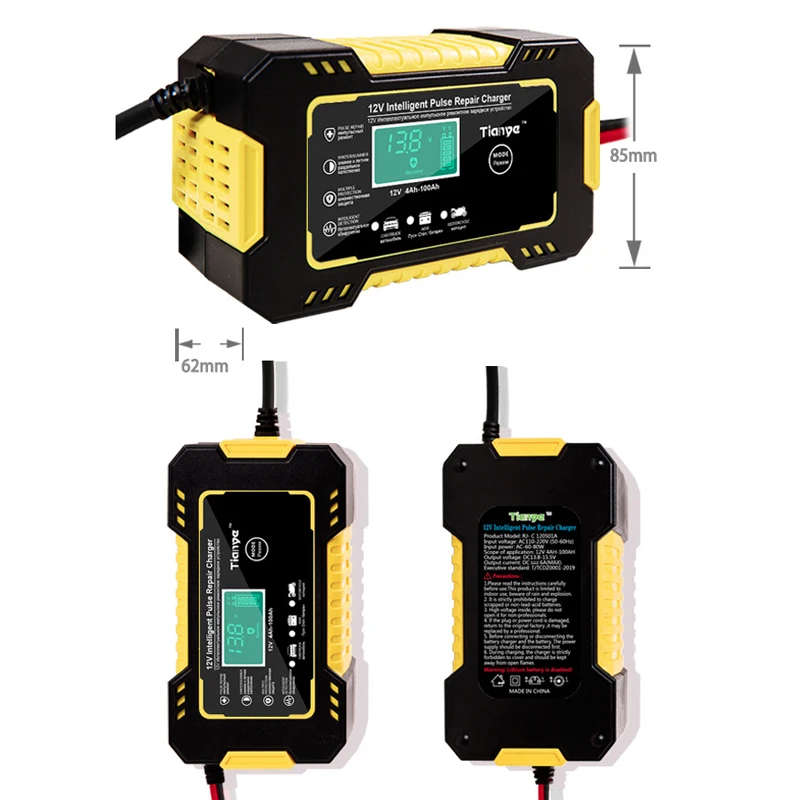Параметр: * Цвет: желтый + черный * Материал: пластик + электронные компоненты * Входное напряжение: 110-220 В * Выход напряжение: 13,8 V-15,5 V * Ток разряда: 6А * Длина входной линии: 90 см * Длина выходной линии: 65 см * Диапазон применимых батарей: 12V 2Ah-100Ah * Применимый Тип аккумулятора: наиболее свинцово-кислотных аккумуляторных батарей типа, включая кальций, гель и AGM, влажный тип, высокое качество, EFB, аккумуляторная батарея 12V трехкомпонентная литиевая батарея, 12V Железный литиевая и т. д. Характеристика: * Шесть интеллектуальных защитных систем: защита от перегрева, защита от перегрузки по току, защита от перенапряжения, защита от низкого напряжения, защита от короткого замыкания, защита от обратного подключения. * Это полностью автоматическое зарядное устройство с 3 этапами зарядки, постоянной текущей зарядкой, постоянной зарядкой напряжения и плавающей зарядкой. * Внешний вид изготовлен из огнезащитного материала ABS, изолирован, огнестойкий и устойчивый к высоким температурам. * Антифриз мягкий медный сердечник, с полным покрытием крокодил, прочный и прочный. * Трансформатор из чистой меди, стабильный выход, высокая скорость преобразования, энергосбережение. * Автоматическая зарядка предотвращает перезарядку аккумулятора, поэтому вы всегда можете подключить зарядное устройство к батарее. * Они также могут помочь восстановить сливные и сульфированные батареи. * Подходит для большинства типов батарей, включая кальций, гель и AGM, влажные батареи. Они также могут помочь восстановить истощенные и сульфированные батареи. Примечание: * Из-за влияния многими факторами, такими как яркость дисплея и светильник яркости, в зависимости от фактического цвета изделия могут быть повреждены во время быть s светильник ly отличаться от показанного на изображении показаны на веб-сайте. * Пожалуйста, позвольте данным иметь небольшое отклонение от ручного измерения. Содержит: * 1x зарядное устройство Содержит: * 1x зарядное устройство