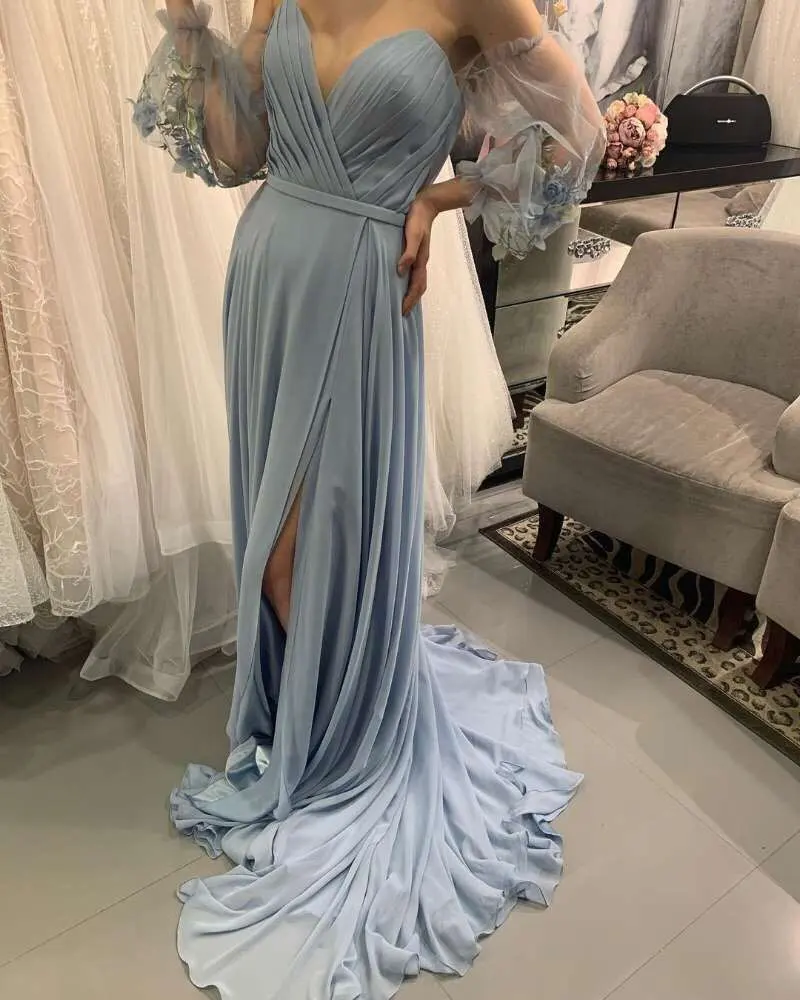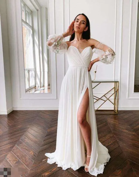 Женское шифоновое свадебное платье с разрезом, рукавами-фонариками и бантом на боку