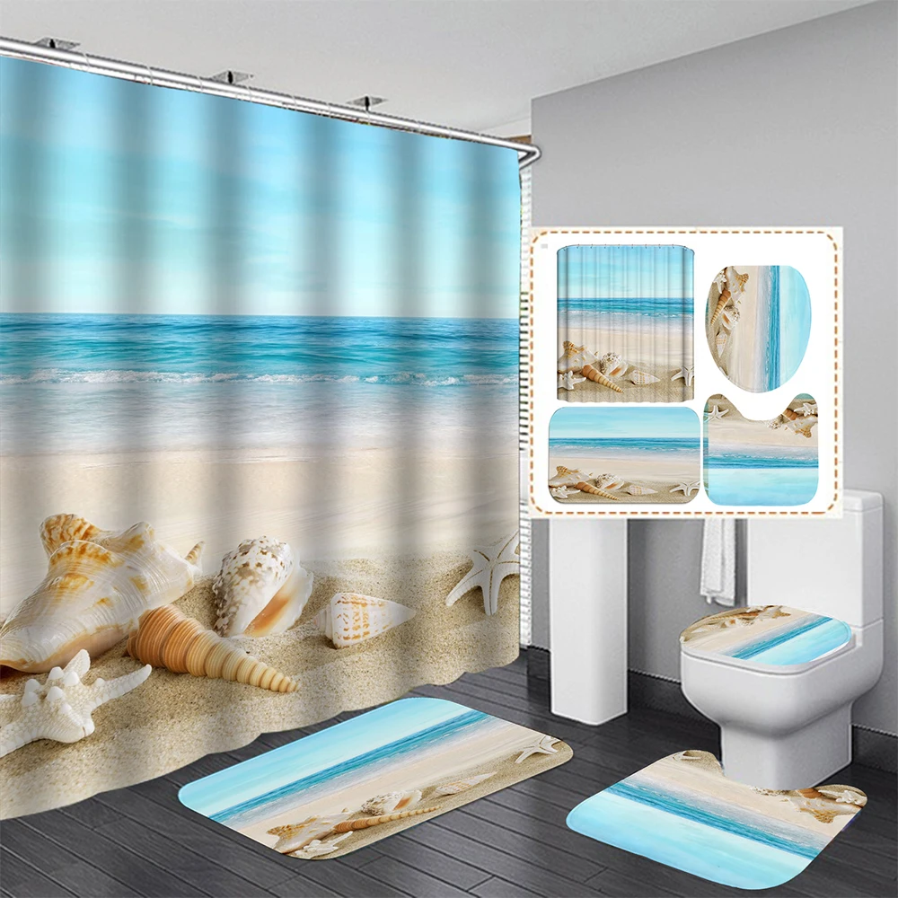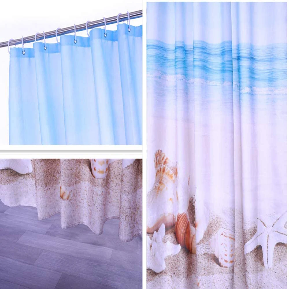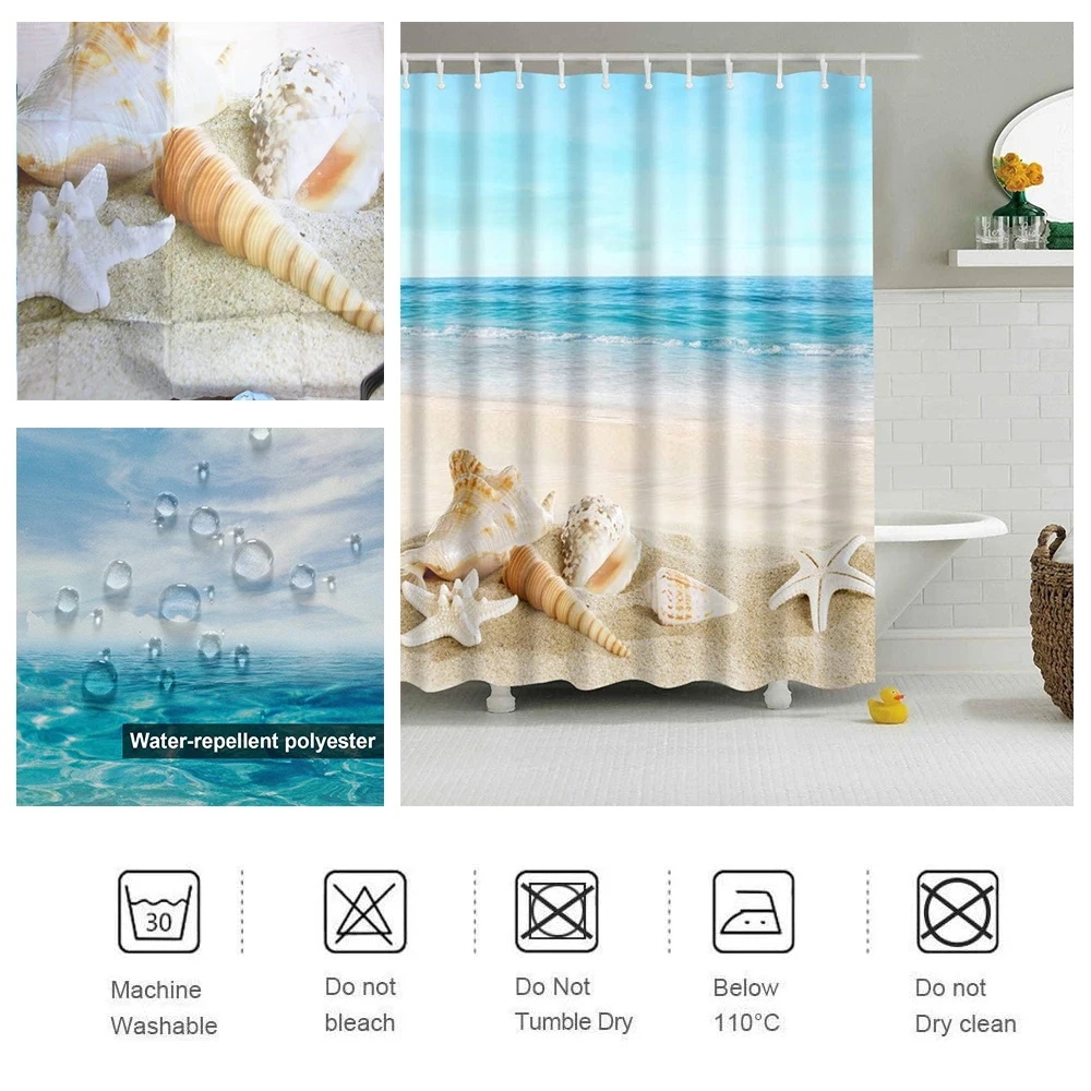 Partern: морской живописный пляж shelМатериал штор: полиэстерМатериал коврика: бархатная ткань + поливинилхлорид(ПВХ) Сетчатое дноХарактеристики: водонепроницаемый, мягкий и прочныйИспользование: украшение для дома и отеляПосылка включает в себя:1 занавеска для душа + 12 пластиковых крючков Очень мягкая ткань высокой плотности, удобная, Экологичная, хорошая вентиляция.
