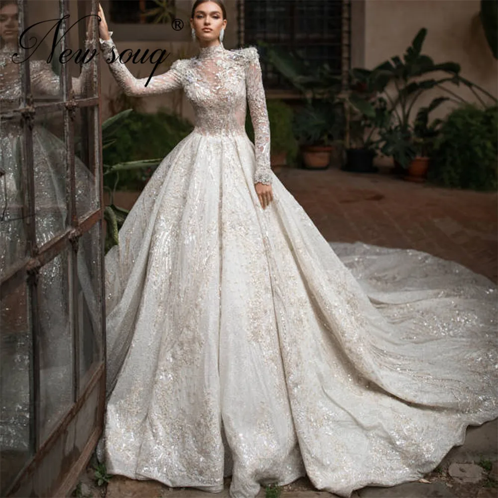 Великолепные Свадебные платья с длинным рукавом Robe De Mariee 2021, Украшенные бусинами, жемчужинами, ручная работа, Дубай, платья для невесты, мусульманские Арабские свадебные платья
