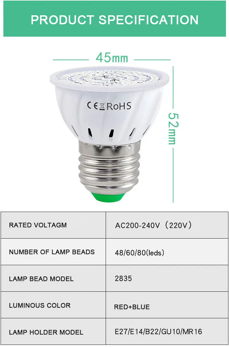 Лампы E27, 486080126200300Светодиодная лампа для выращивания растений, красный, синий свет, промышленные лампы