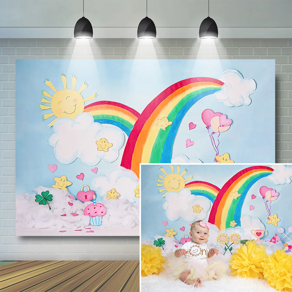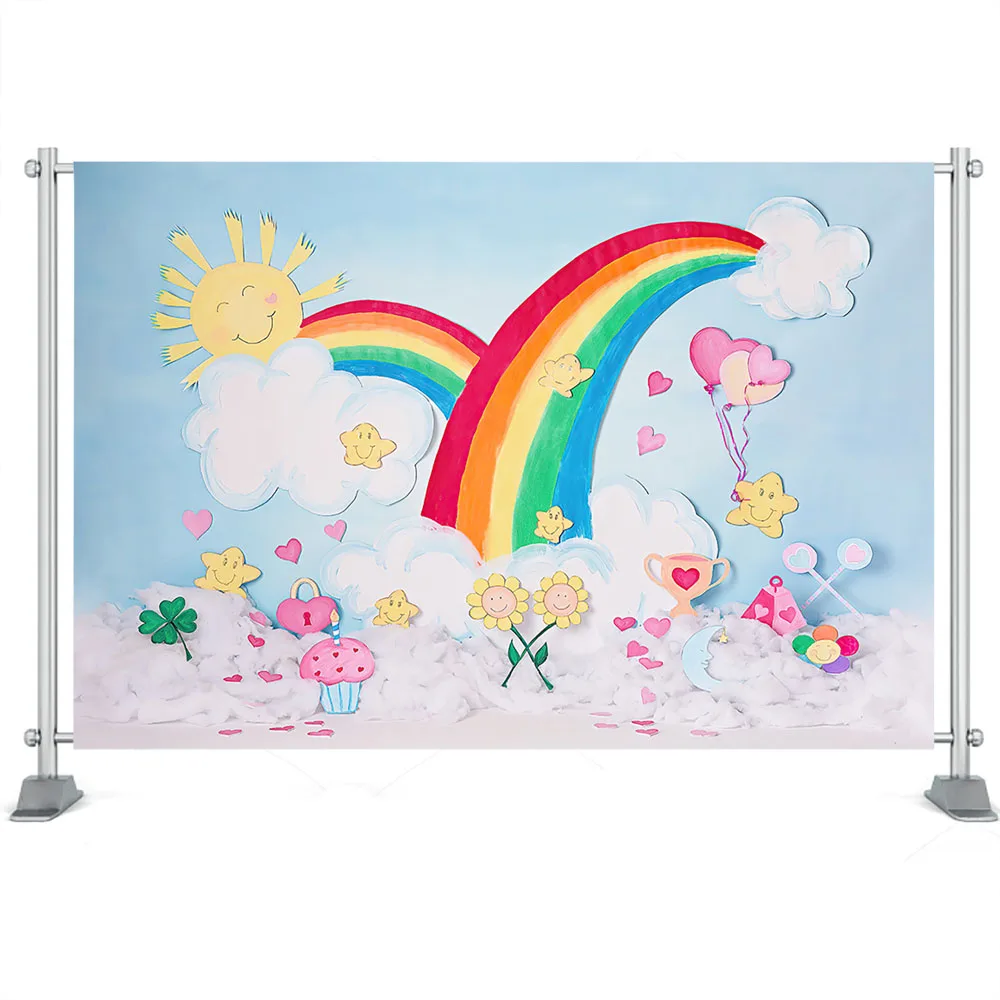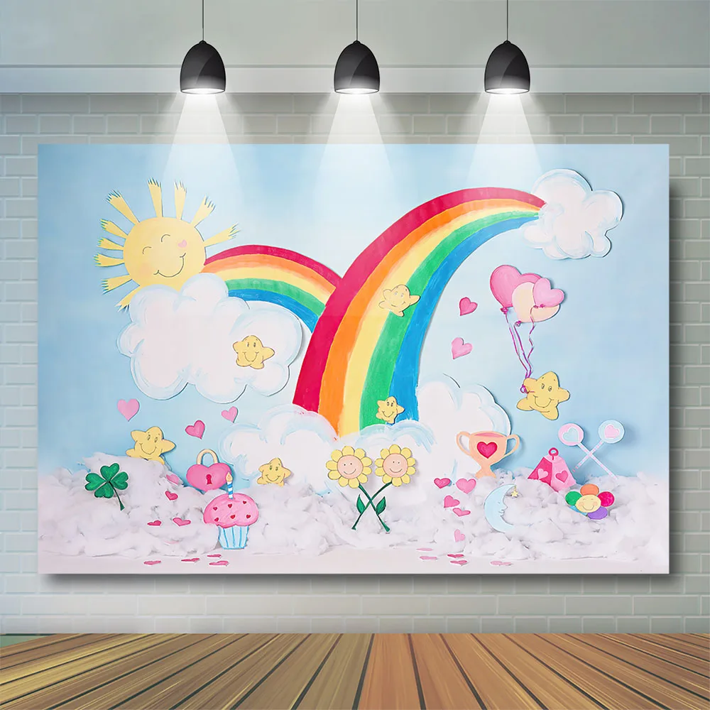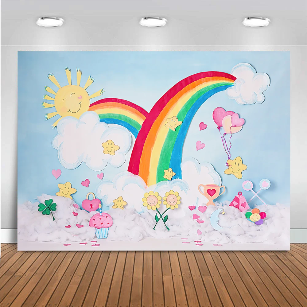 Фон для фотостудии с изображением радуги детского торта белых облаков сладких звезд блестящих огней для девочек