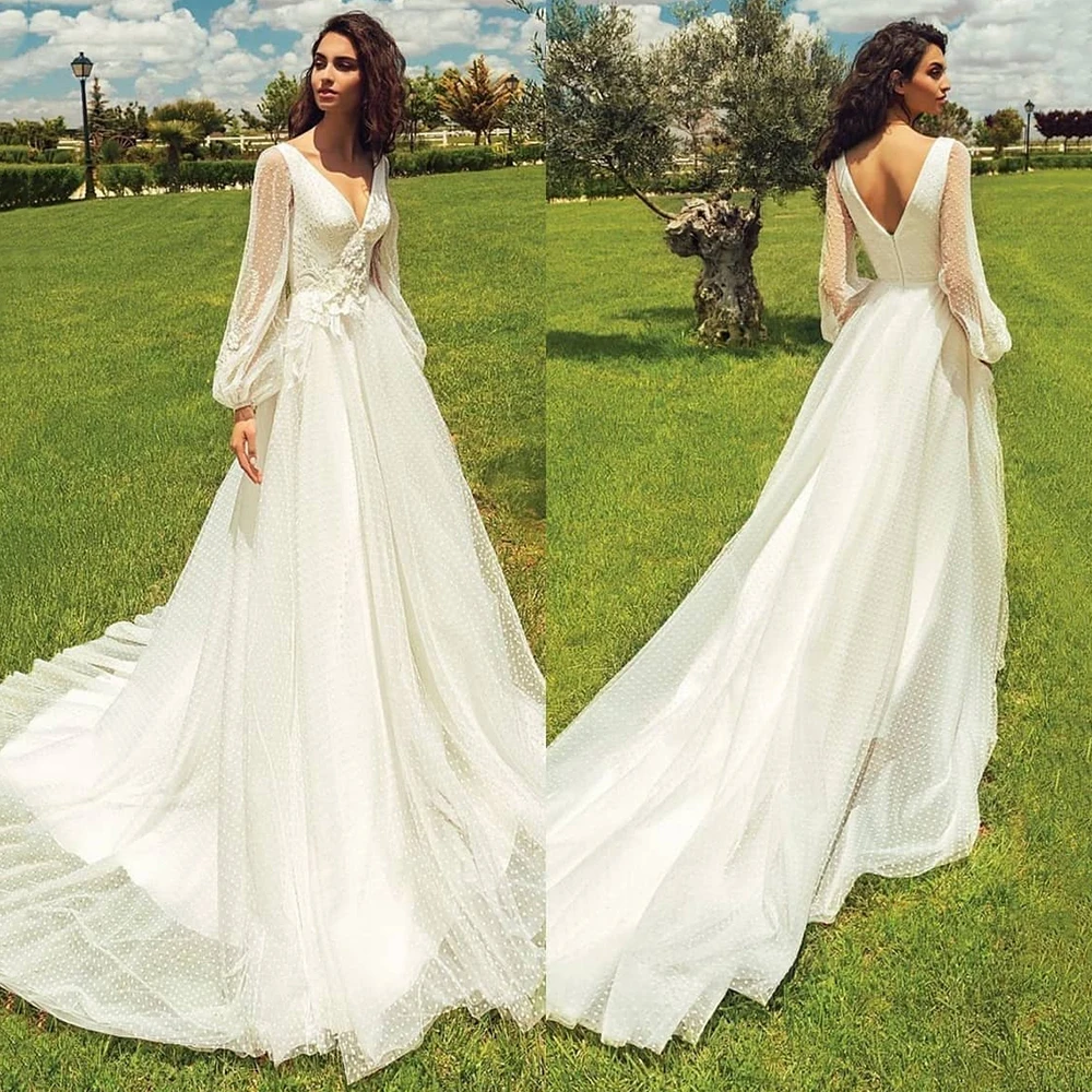 Свадебное платье-трапеция UZN в стиле бохо с длинными рукавами и V-образным вырезом, Сетчатое свадебное платье в горошек, кружевное платье для невесты с аппликацией