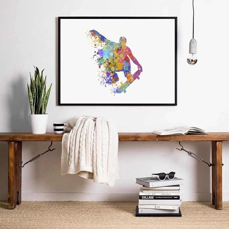 Акварельный скейтборд, спортивные принты на холсте и плакат, картина с прыжками и трюками, настенные художественные картины для мальчиков, детская комната, домашний декор