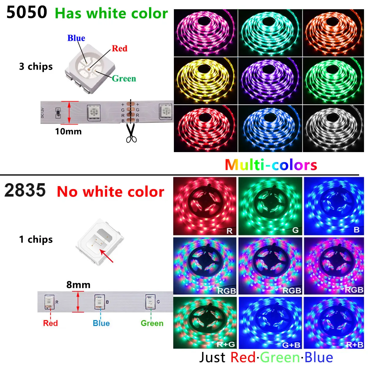 2835 без белого цвета, может отображать красный зеленый синий цвет одновременно 5050 с белым цветом, может отображать только один цвет за раз При воспроизведении музыки световая полоса начнет мигать со звуком