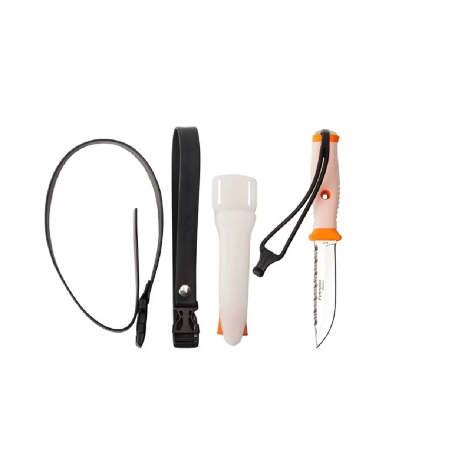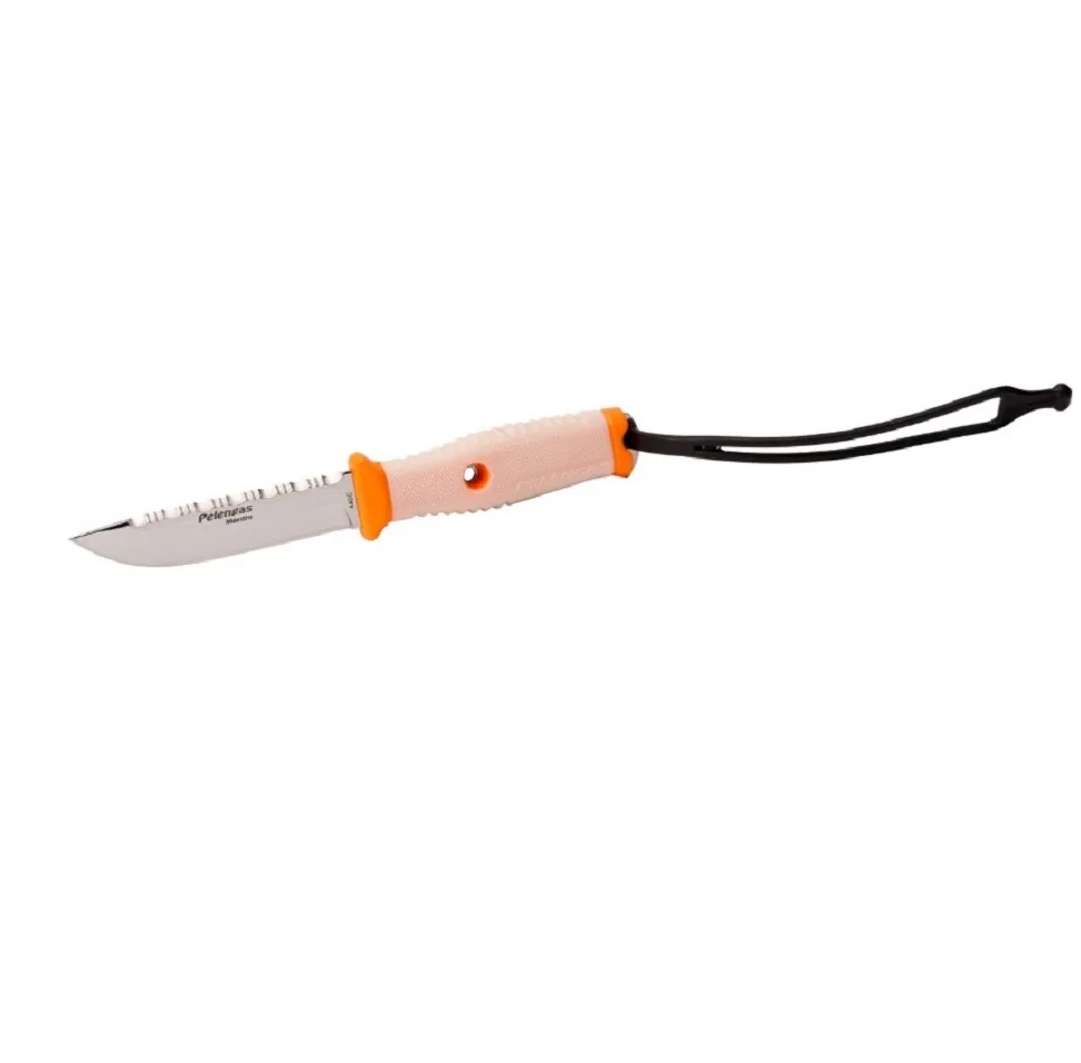 Подводный нож Pelengas Universal Maestro (Пеленгас Универсал Маэстро), изготовлен из нержавеющей стали, лезвие классической сабельной формы с серрейторной заточкой, рукоять с полимерной антифрикционной накладкой. Сабельная форма лезвия позволяет использовать нож Маэстро не только под водой, но и в бытовых условиях. С одной стороны лезвия – прямая заточка, с другой стороны – серрейтор. Лезвие изготовлено из стали 440C и закалено до твёрдости 57-58 единицКомплектуется магнитными ножнами и резиновыми ремешками с пряжками типа фастекс для крепления на ногу или руку. Ножны подходят под большинство моделей ножей, даже если ныряльщик потеряет нож Пеленгас, он всегда сможет использовать эти ножны с любым другим ножом.Особенности:Магнитная фиксация в ножнах;Удобная прорезиненная рукоять, нож не скользит даже в мокрой перчатке;Посередине рукояти ножа сделано отверстие, благодаря которому нож можно использовать в качестве заряжалки;Функциональное лезвие, которое проходит через всю рукоять ножа;Магниты в ножнах полностью изолированы и не подвержены коррозии и воздействию соленой воды;Нож Пеленгас Универсал Маэстро комплектуется резиновым темляком для крепления ножа на руке, так же с его помощью нож можно дополнительно зафиксировать в ножнах. Темляк очень прочный и хорошо растягивается.Длина лезвия - 10,5 см;Общая длина - 21,5 см.
