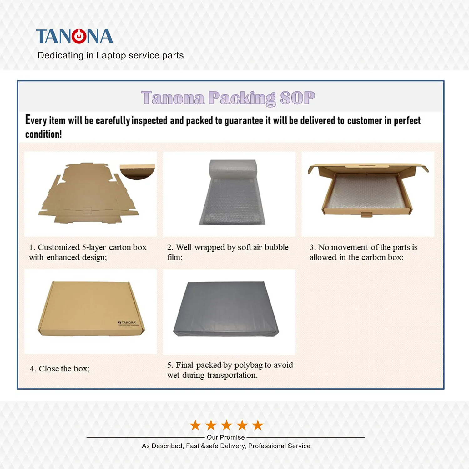 Компания Tanona была основана в начале 2008 года и занимается производством запчастей для ноутбуков. В течение многих лет развития, мы имеем нашу собственную профессиональную команду обслуживания, сильную цепочку поставок и хранилище.