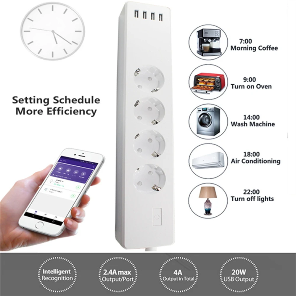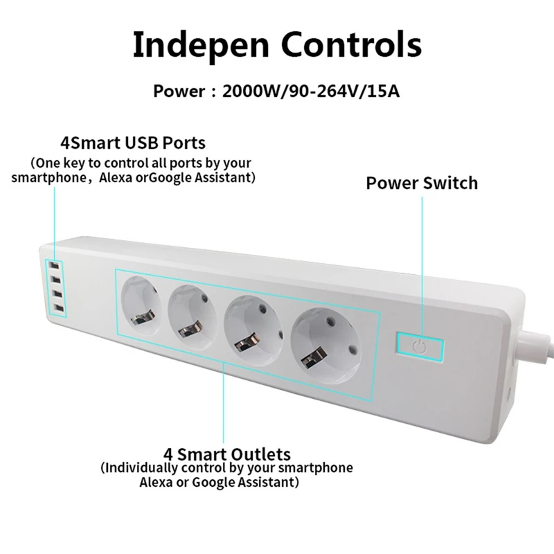 Голосовое и дистанционное управление --- ручное Голосовое управление + дистанционный ограниченный пульт дистанционного управления. Умная розетка работает с Alexa Echo, Google Home и Smart Life App, все устройства подключены под контролем. Скажите им, чтобы включить/выключить розетку. С помощью приложения вы можете легко управлять устройством в любом месте в любое время, не требуется концентратор. Умная полоса питания USB для зарядки --- независимое и групповое управление доступно для 4 розеток переменного тока, позволяет включать/выключать подключенные устройства в группе или в одном. 4 порта USB для зарядки поддерживают быструю зарядку макс. 2,4 А, которую можно включить/выключить за раз. Установите расписание и поделитесь с семьей --- как вы получили историю устройств electric consump, вы можете настроить свой собственный график для любых бытовых приборов автоматически ВКЛ и ВЫКЛ по мере необходимости. Поделитесь устройством с семьей, все члены могут управлять гнездом. Не беспокойтесь, когда телефон выключен. Умный и безопасный срок службы --- эта интеллектуальная полоса питания позволяет управлять всеми подключенными приборами с помощью variouse. Использование высококлассного огнестойкого материала, с безопасной дверью для детей и домашних животных, надежное в использовании.