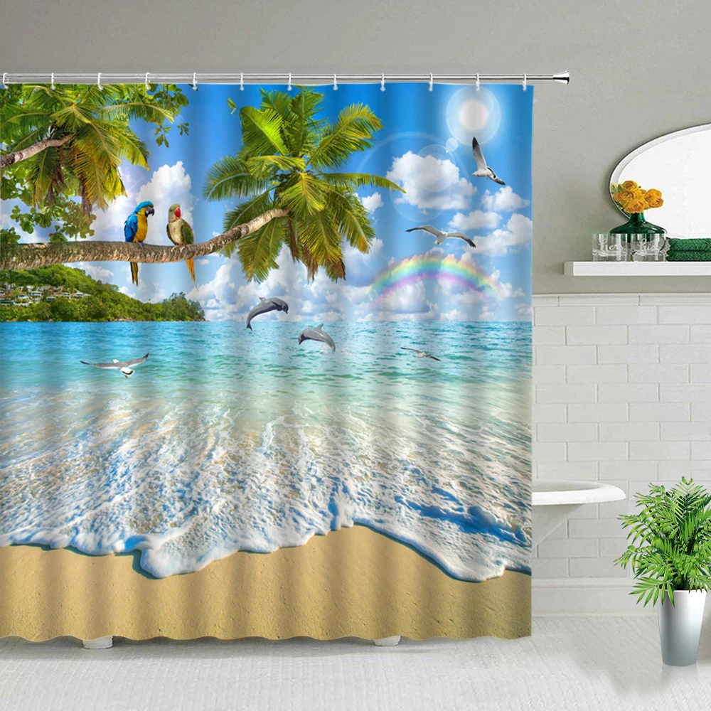 Занавеска для душа с рисунком морского побережья, моря, кокосового ...