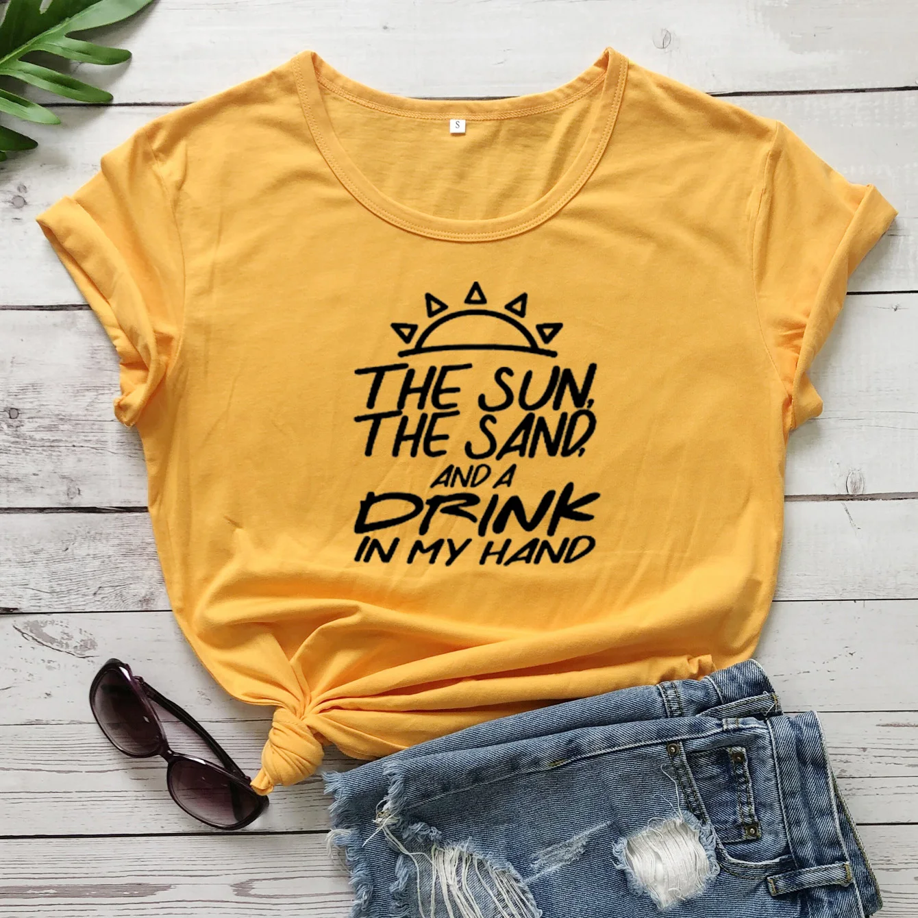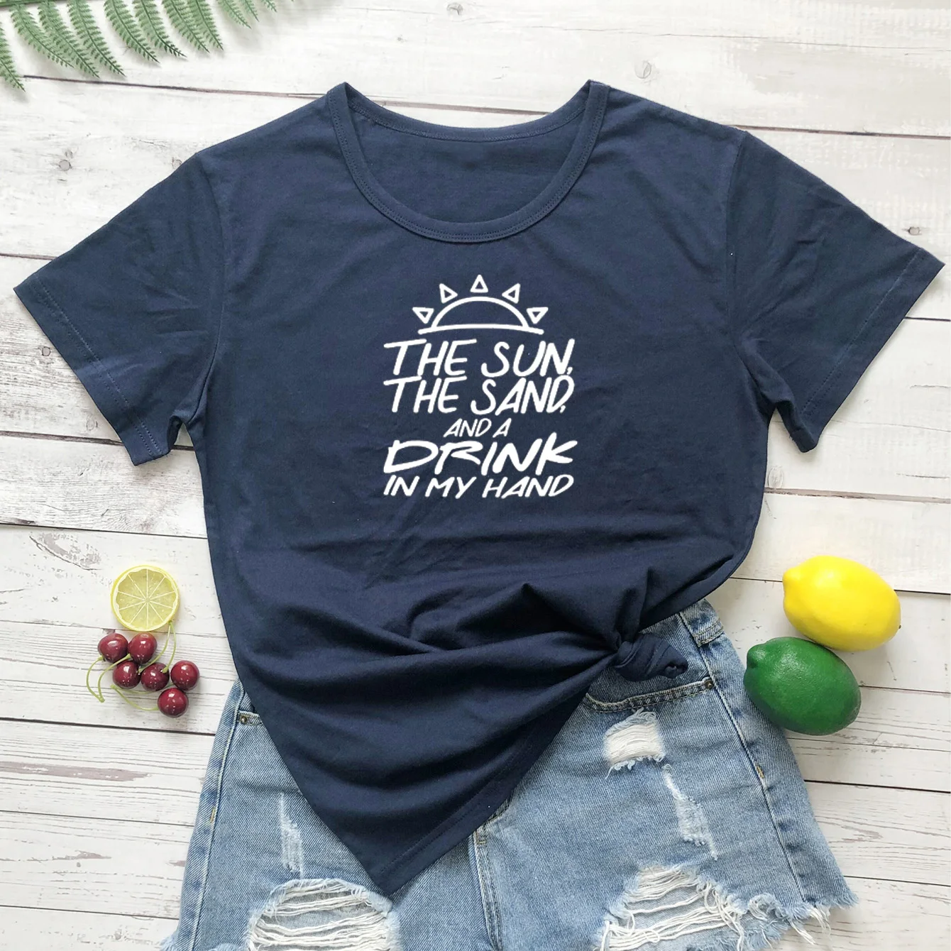 Футболка унисекс с надписью The Sun The Sand And A Drink In My Hand, забавная Повседневная футболка из 100% хлопка, с цитатой
