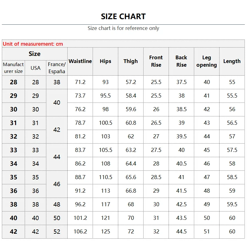 Единица измерения: см 1. Размер-китайский размер, размер брюк 32 = 32 дюйма, талия = 81,5 см, талия. Пожалуйста, сообщите нам свой рост и вес, и мы предложим вам подходящий размер. 2. Данные измеряются вручную, возможна погрешность в 1-3 см, пожалуйста, поймите. 3. Из-за различий в освещении и различных разрешениях монитора, могут быть вызваны небольшие хроматические аберрации. Пожалуйста, ознакомьтесь с фактическим цветом полученного товара.