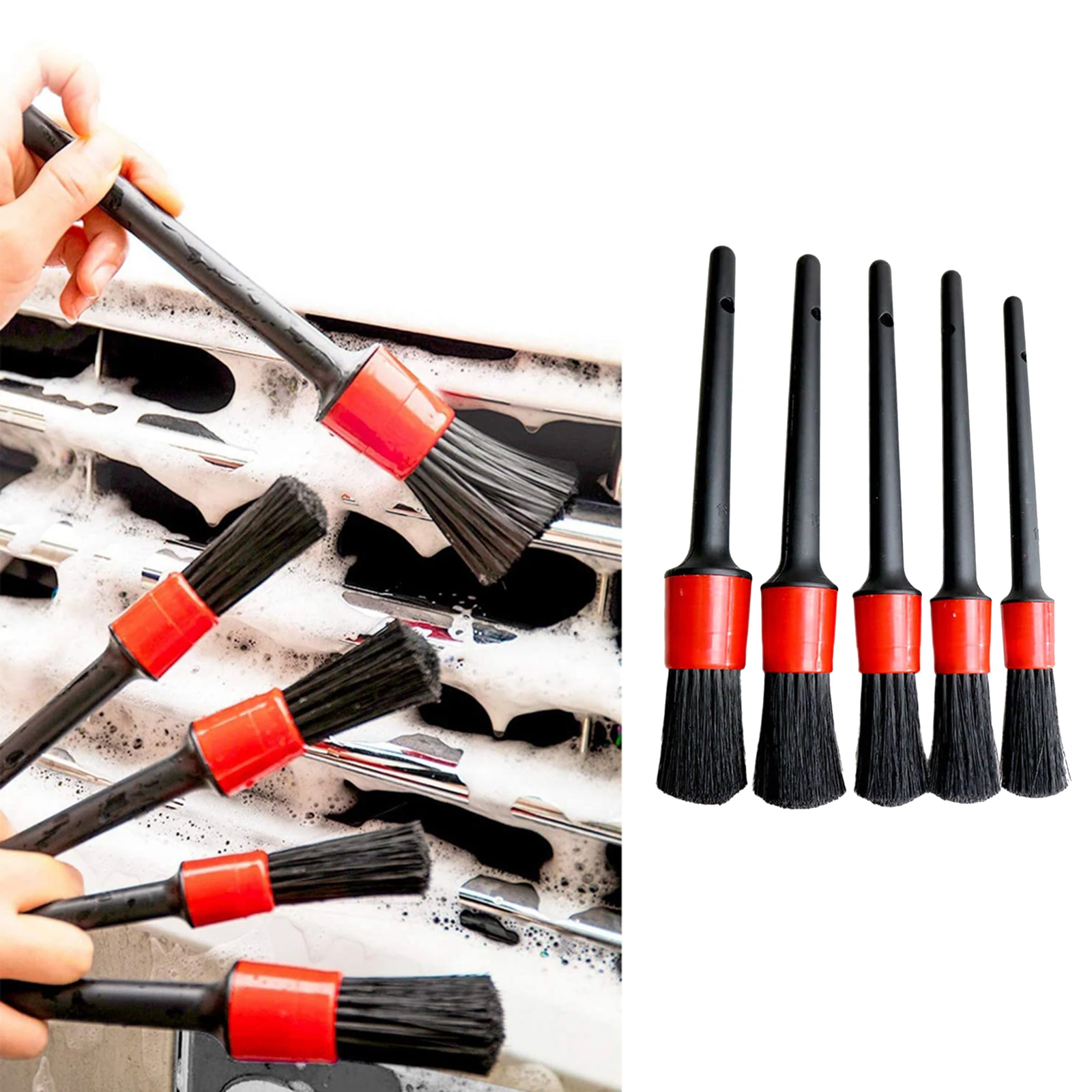 5 разных размеров кистей для удовлетворения ваших потребностей.Достаточная длина, легко исследовать и проникать в гайку, узкое пространство.Нет металлических деталей, невозможно повредить или поцарапать прецизионные колеса.Мягкая щетка подходит для сидений из мягкой кожи или наружные знаки.Каждая кисть имеет крючок для удобной переноски. Многофункциональная щетка, Влажная и сухая.