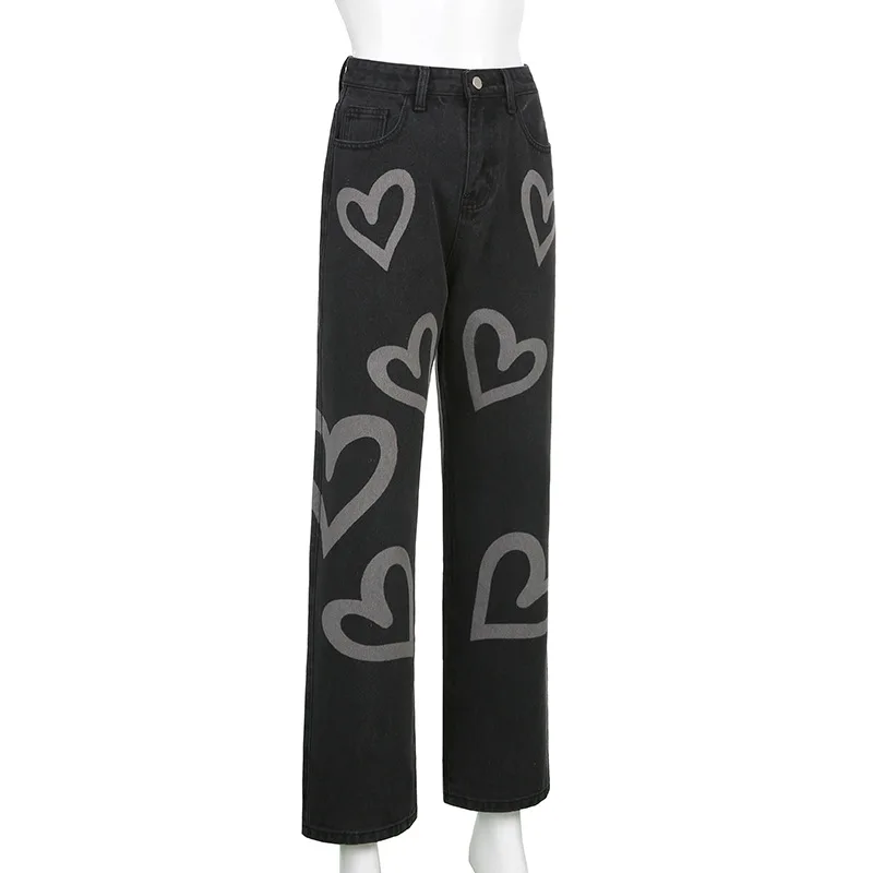 Винтажная одежда Y2K джинсы с рисунком сердца граффити мешковатые E...