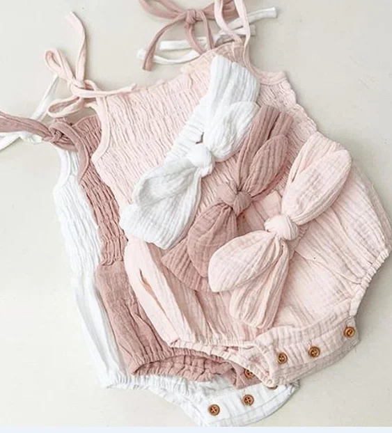 Летняя одежда для новорожденных Одежда для маленьких девочек из хлопка и льна Боди без рукавов однотонное Полосатое боди повязка на голову, комплект детской одежды