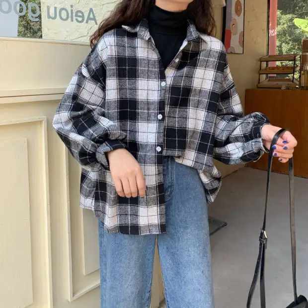 Женская рубашка на пуговицах, осенняя клетчатая рубашка с воротнико...