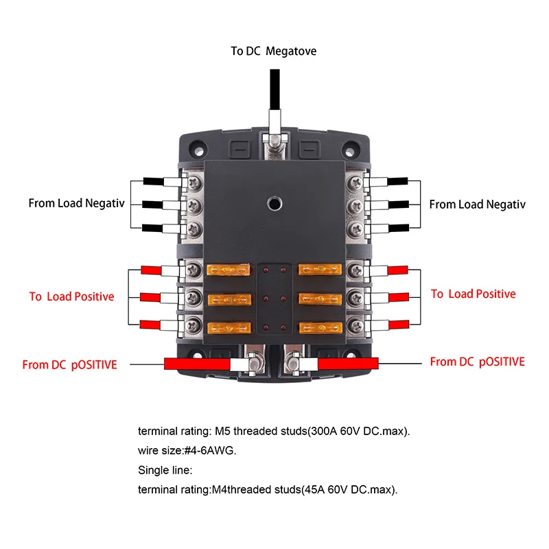 Name 3positive and negative one in and out fuse box with LED indicator light